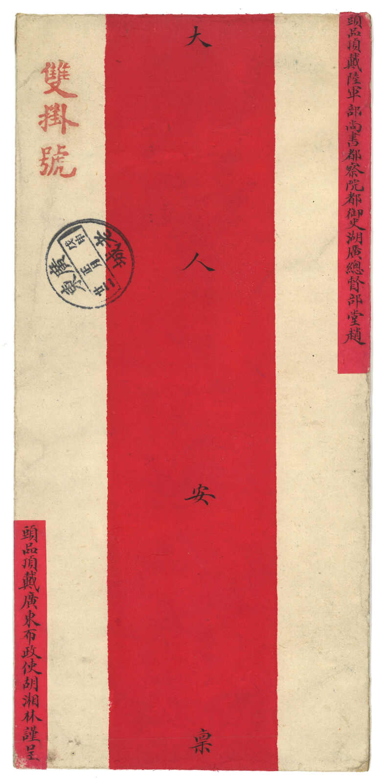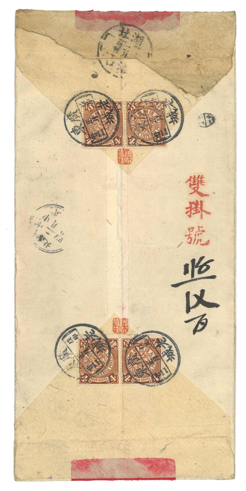 1905 image1908 (23 Feb) Double registered cover by Kwangtung Administration Commissioner to the Governor Hukwang, f.w. Coiling Dragon 4c x4 on reverse, tied by Kwangtung Laocheng lunar year cds. Transit Wuchang and arrived at Hankow (6 Mar). Very Fine.