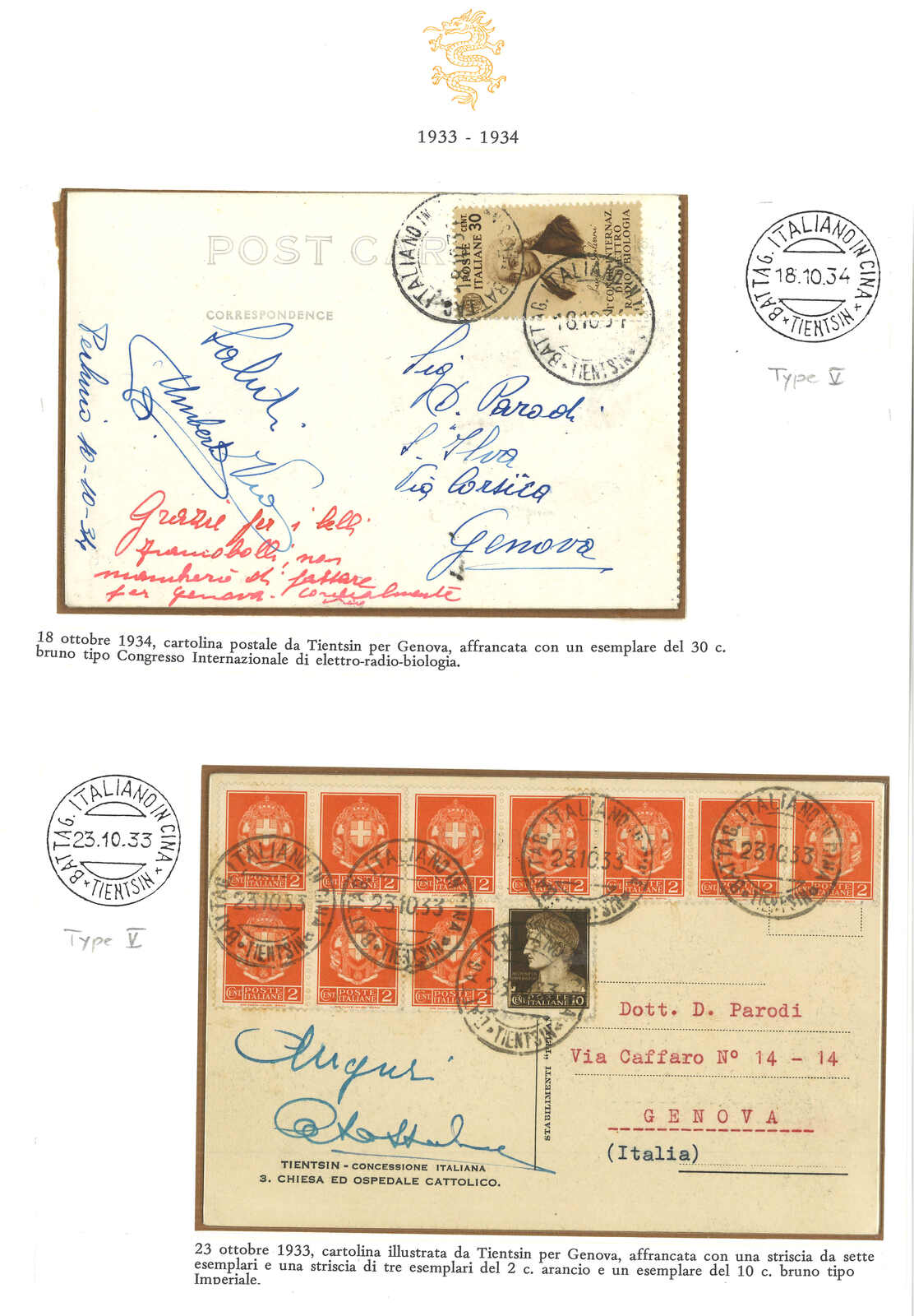 3171 cover image1933 and 1934 a pair of postcards from Italian Battalion in Tientsin to Genova, f.w. International Congress of Electro-Radio-Biology 30c and Daily Stamps respectively, tied by “BATTAG ITALIANO IN CINA / TIENTSIN” type V cds.