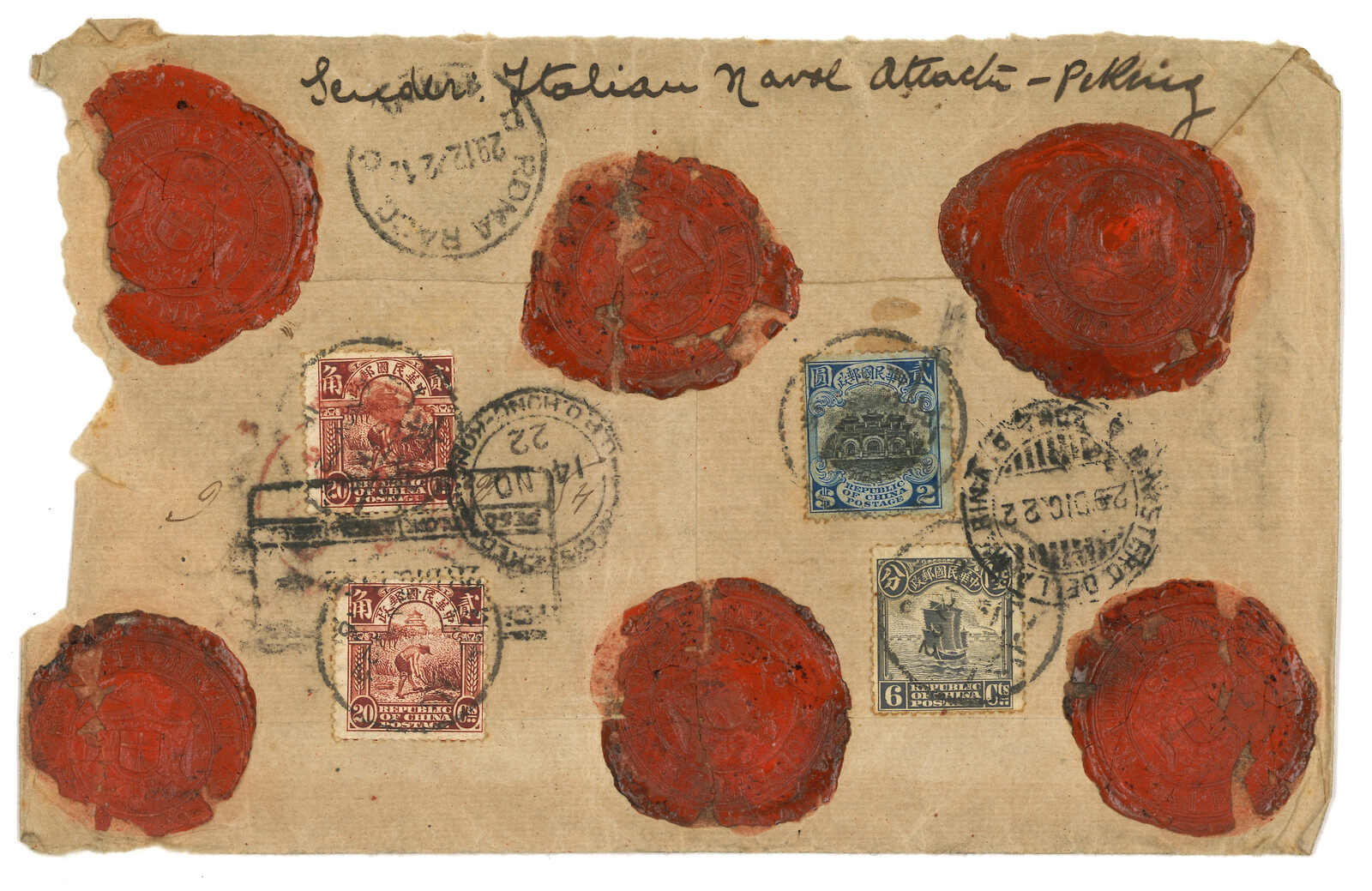 1922.11.6 意大利海軍陸戰隊駐北京分隊寄羅馬海軍部,背面鈐六處“R ADDETTO NAVALE”火漆,貼帆船6分 + 農穫圖2角x2 + 宮門2元,銷北京半切漢英日戳。寫有“Via Russia”批示。極為稀罕少見之意大利駐華部隊實寄保價封。(Image 1) (Image 2)