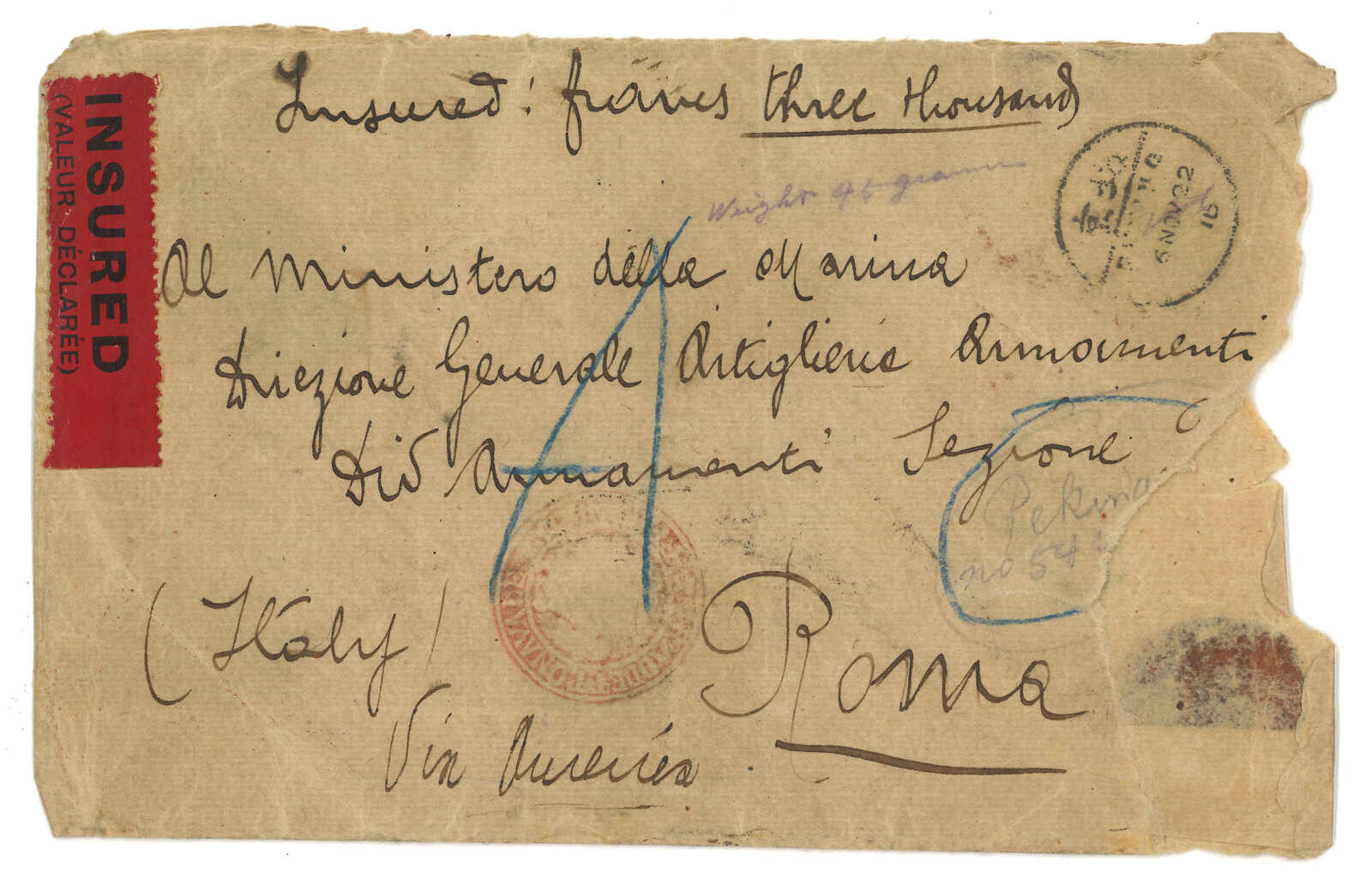 3164 cover image1922 (6 Nov) Insured cover from R. Marina Italiana Pechino to Ministero della Mariana Roma. Applied with "R ADDETTO NAVALE" wax seal x6 on reverse. F.w. Junk 6c + Reaper 20c x2 + Hall of Classic $2 on reverse, tied by Peking bisected bilingual cds. Showing "Via Russia" annotation on front. Very scare commerically used insured cover from Italian troop in China.