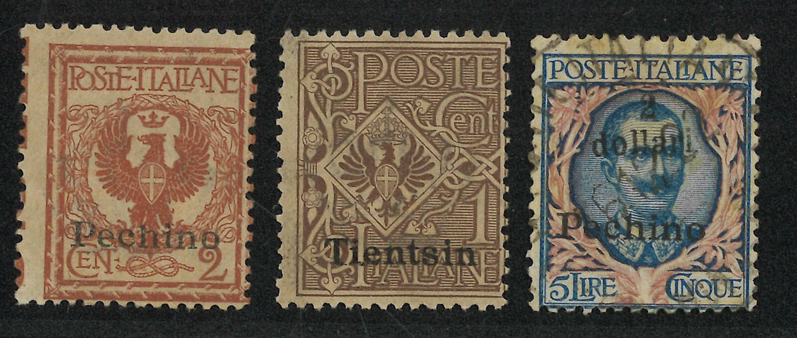 3165 */o image1917-1919 a group of 3 Italian post in China issue, including Pechino 2c, Tientsin 1c and more valuable Pechino surch $2/5 Lire (Chan FI-27). Former 2 mint while latter used.