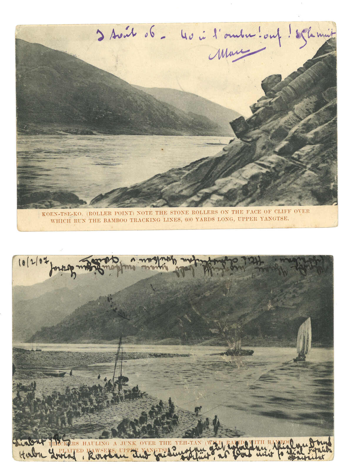 1906及1907年一對長江風光明信片,均由重慶法局寄出,貼航海及商貿神像加蓋TCHONGKING連中文面值票。均經漢口法局中轉。一件另鈐上海法局中轉戳。(Image 1) (Image 2)