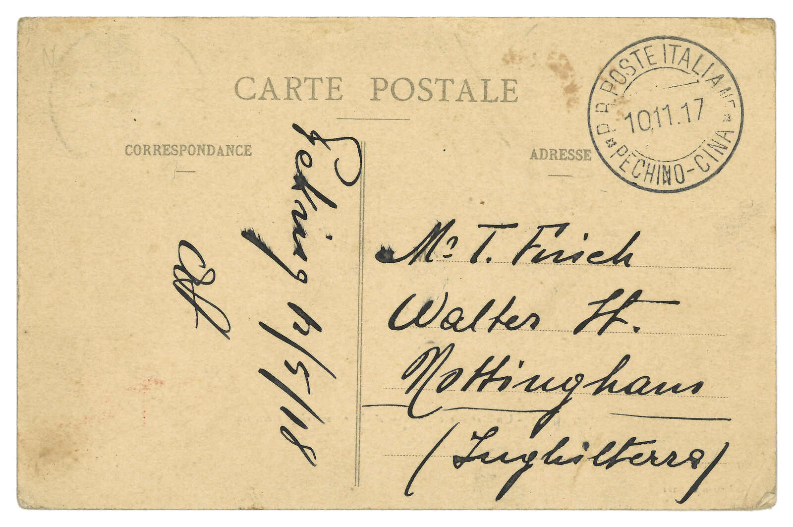 1917.11.10 北京寄英國。圖片明信片,貼意大利票加蓋Pechino 10分(陳目FI-12),銷北京意國客郵局日戳。2014.12 布約翰。(Image 1) (Image 2)