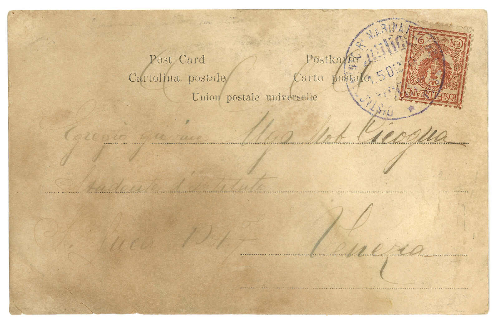 約1930年代意大利海軍陸戰隊寄意大利。圖片明信片,貼意大利票2分,銷少見難得之“Distaccamento R. Marina”紫色日戳。(Image 1) (Image 2)