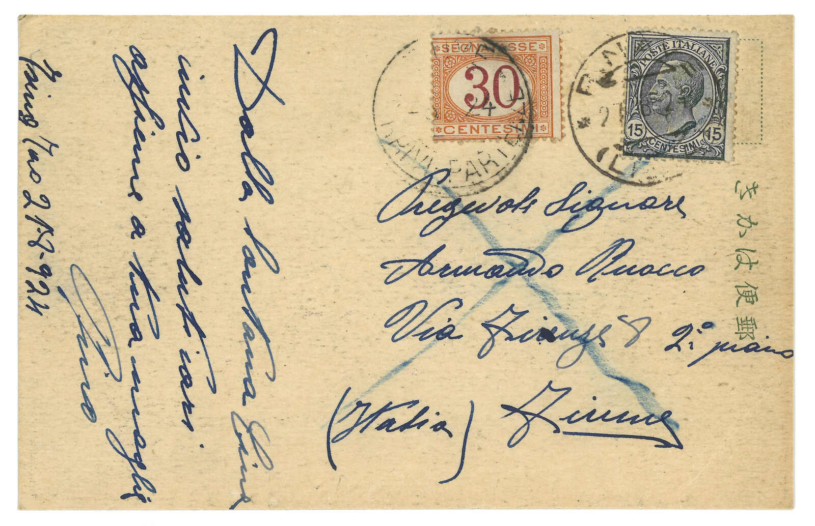 1924.8.27 意軍巡洋艦Libia號自青島寄Fiume。圖片明信片,貼伊曼紐三世15分,銷“R. NAVE / LIBIA” I型日戳。加貼意大利欠資票30分,銷Fiume到達戳。有趣的是,Fiume於同年三月被意大利吞併。(Image 1)