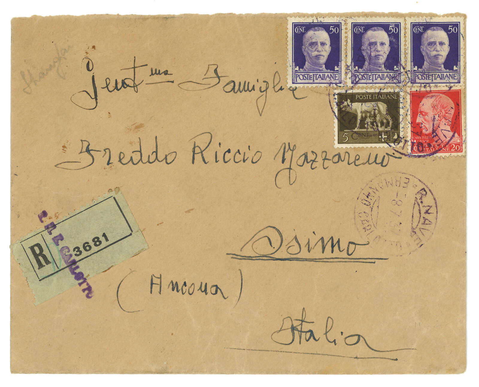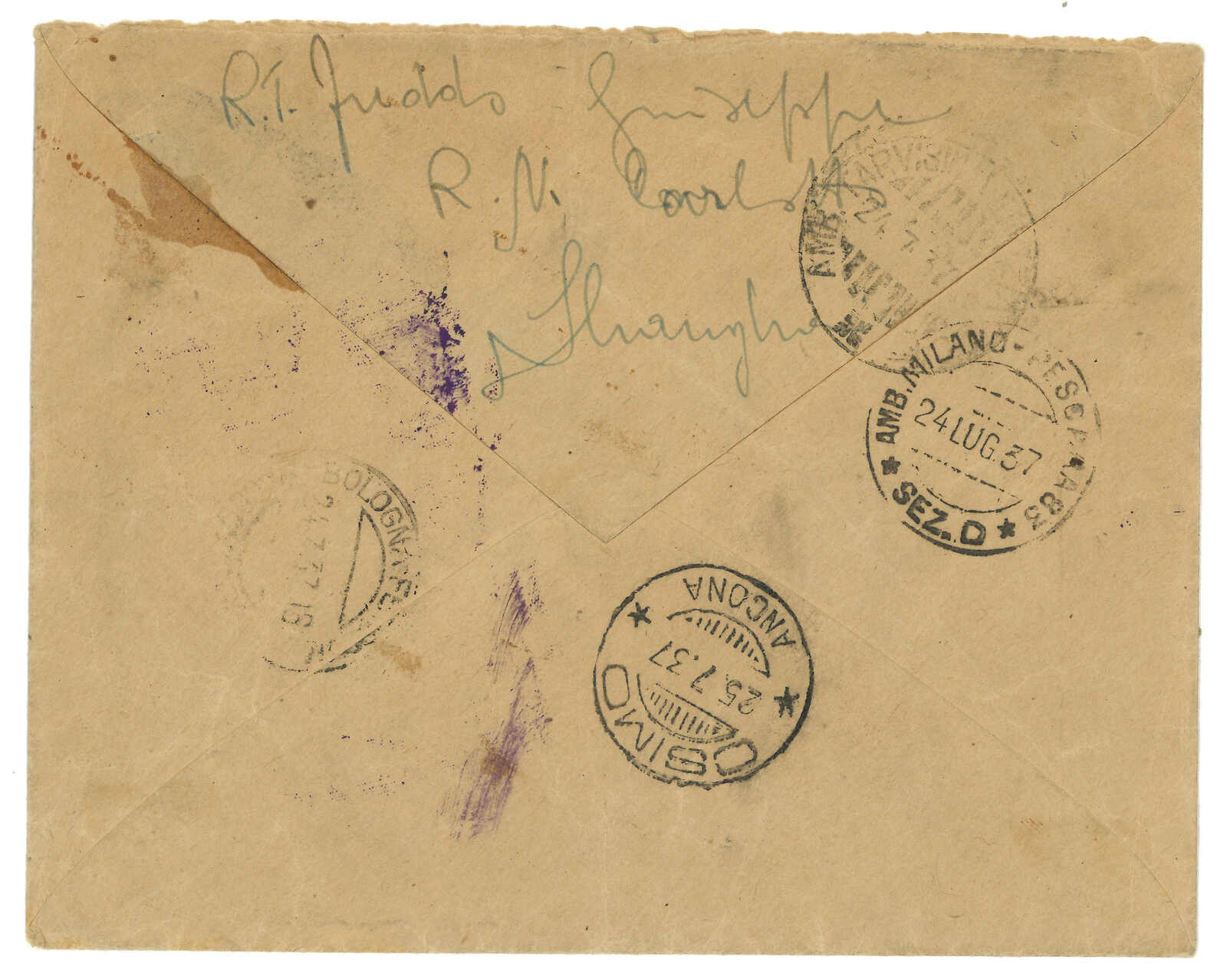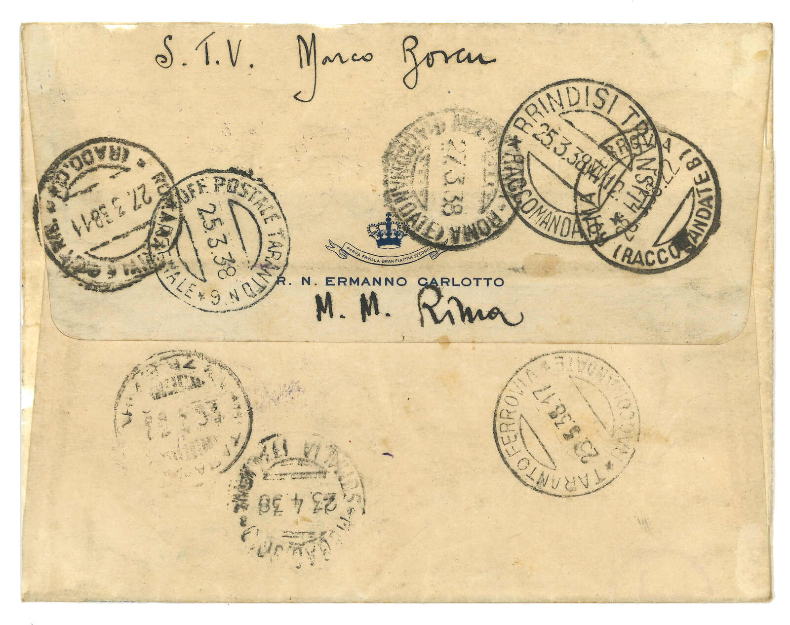 20分,銷“R NAVE / ERMANNO CARLOTTO”日戳,旁貼掛號標籤。7.25抵Osimo。 Ermanno Carlotto號本屬意大利海軍,在意大利投降後被收入日本海軍,二戰後先後收編至民國及新中國海軍。封左側被裁。(Image 1)