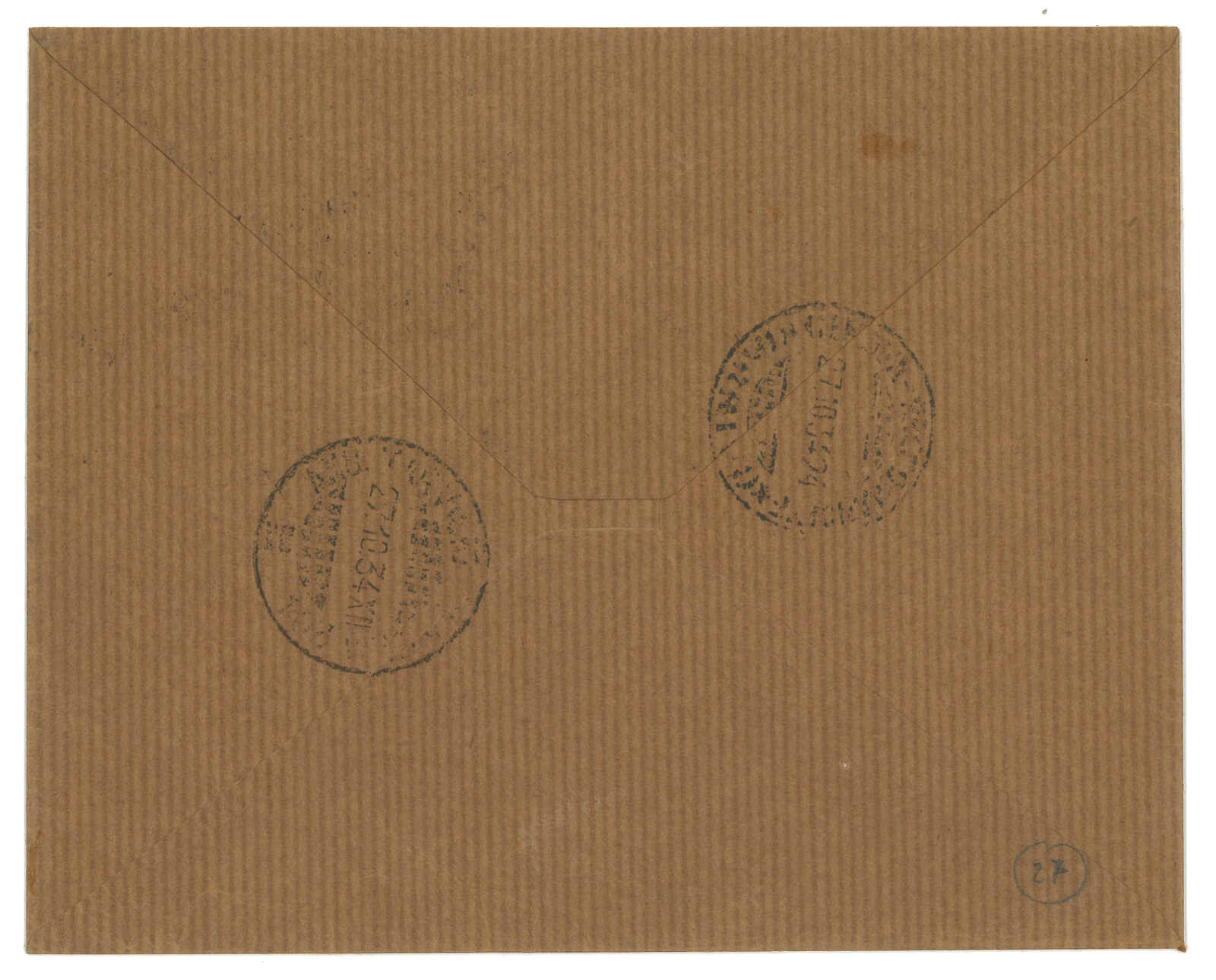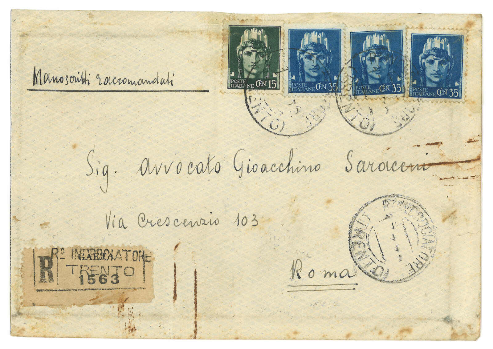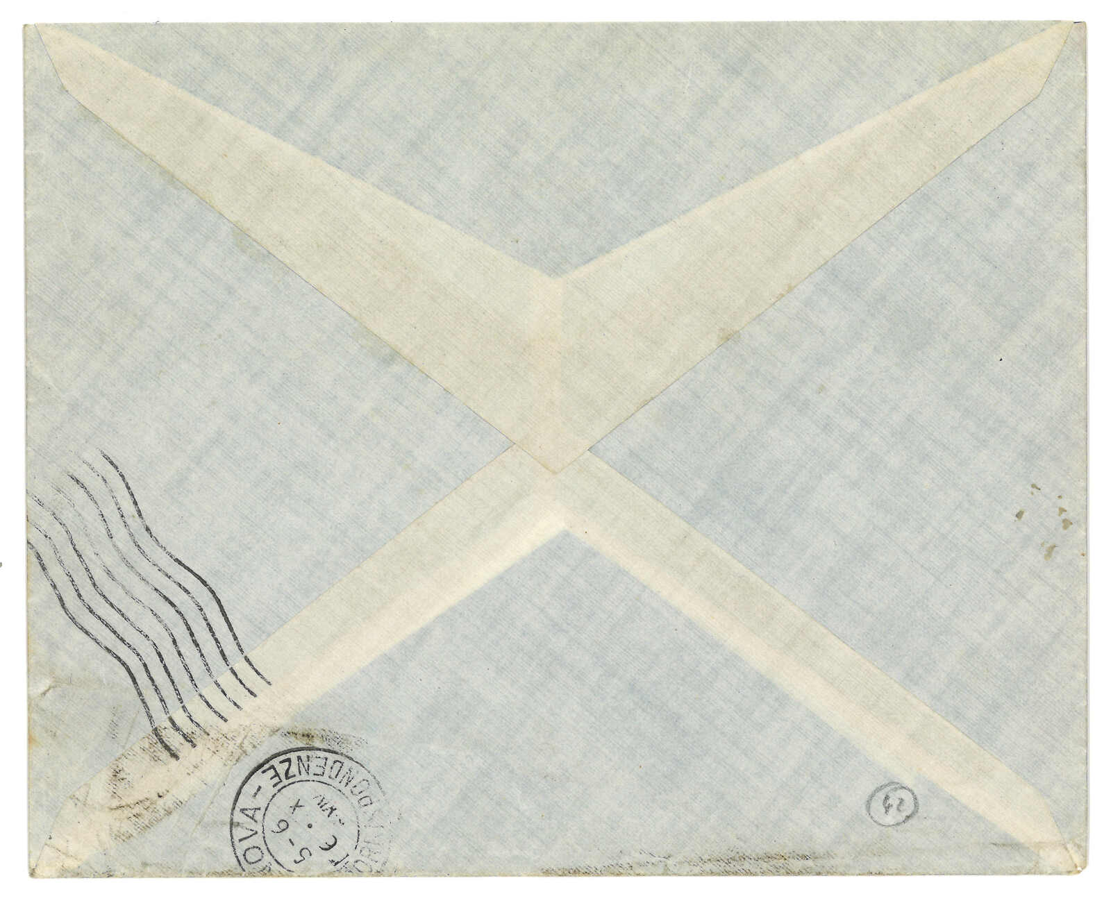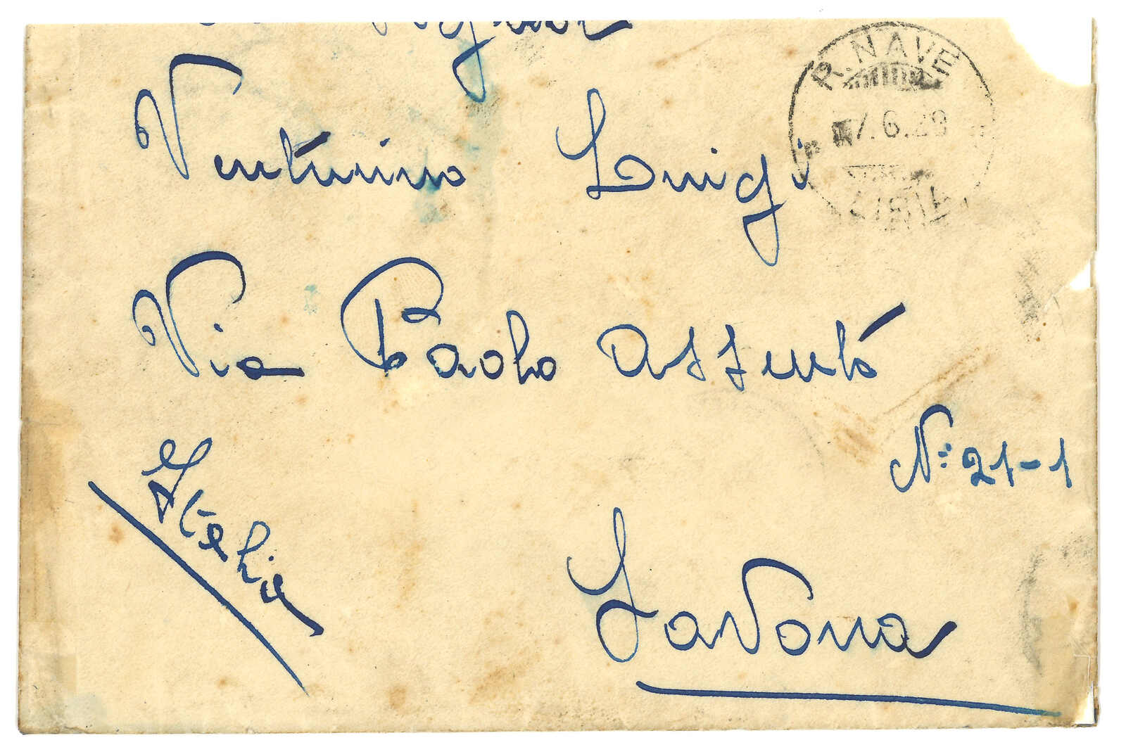 20分,銷“R NAVE / ERMANNO CARLOTTO”日戳,旁貼掛號標籤。7.25抵Osimo。 Ermanno Carlotto號本屬意大利海軍,在意大利投降後被收入日本海軍,二戰後先後收編至民國及新中國海軍。封左側被裁。(Image 1)