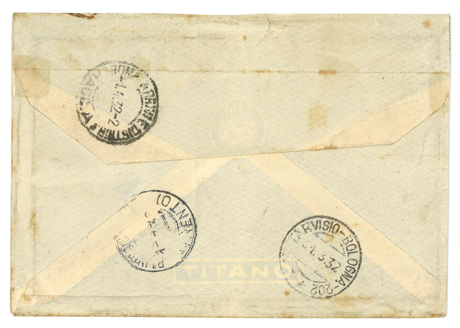 1932.2.11 意軍巡洋艦Libia號寄羅馬,無貼票,鈐稀罕之“REGIE POSTE / COMANDO / SUPERIORE NAVALE IN ESTREMO ORIENTE”海軍陸戰隊橢圓形戳記及Libia號日戳。背面蓋有“COMANDO SUP NAV IN E.O. / R.N. LIBIA”圓戳。3.4抵羅馬。(Image 1)
