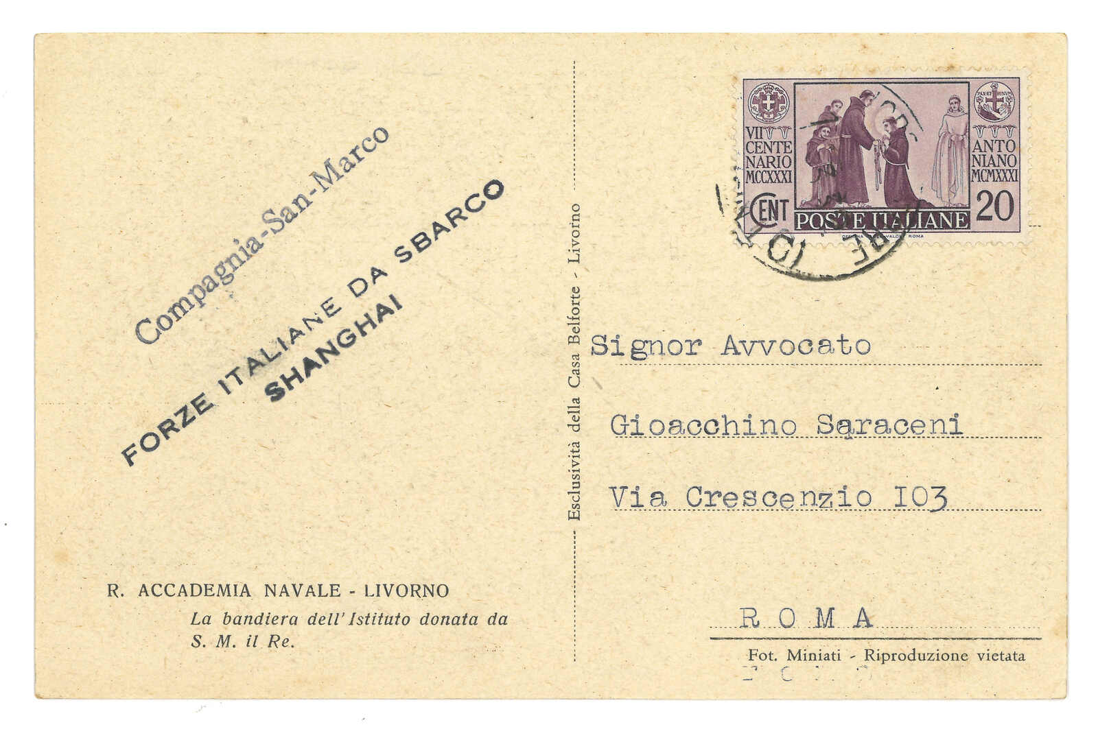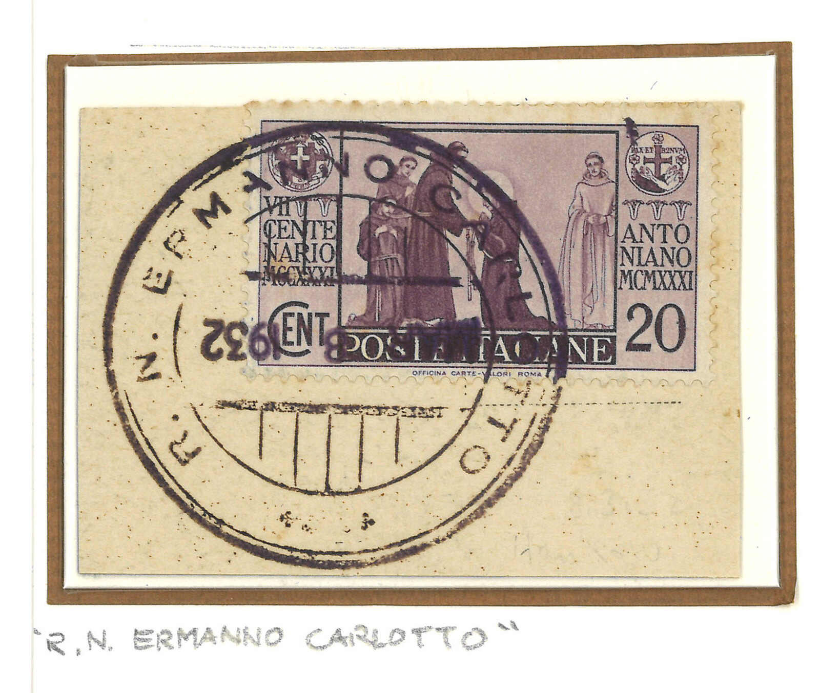 1932.5.3 意軍炮艇Ermanno Carlotto號寄羅馬。圖片明信片,貼St. Antonius 20分,銷少見之“R N ERMANNO CARLOTTO”橢圓形戳記。抵羅馬海軍部。另附一件銷Ermanno Carlotto號之郵票剪片。Ermanno Carlotto號本屬意大利海軍,在意大利投降後被收入日本海軍,二戰後先後收編至民國及新中國海軍。封左側被裁。(Image 1)