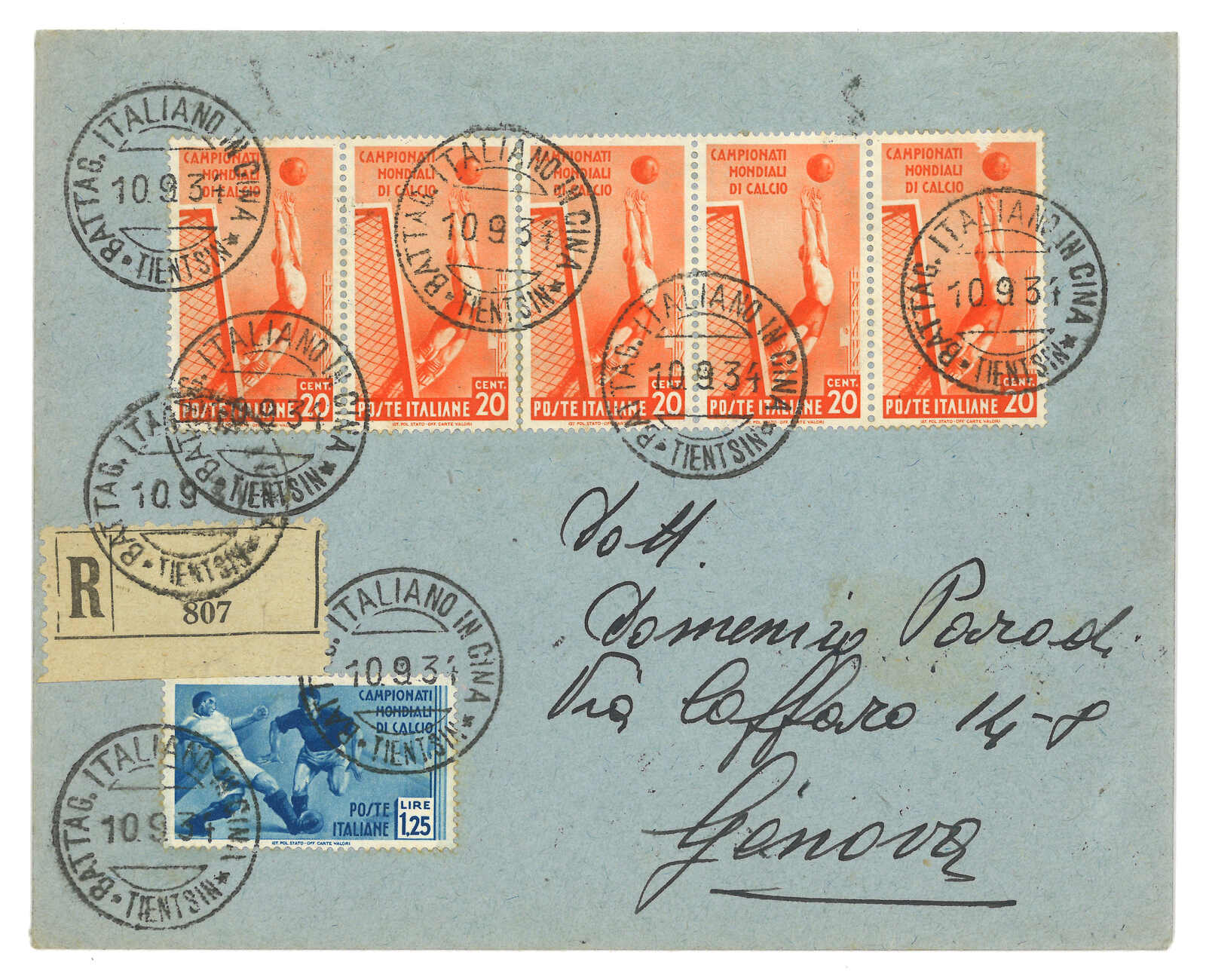 1934 Italian Battalion in Tientsin (10 Sep) to Genova, f.w. Football World Cup 20c in strip of 5 + 1.25lr, tied by "BATTAG ITALIANO IN CINA / TIENTSIN" cds, alongside with registered label. Arrived Genova (27 Sep).