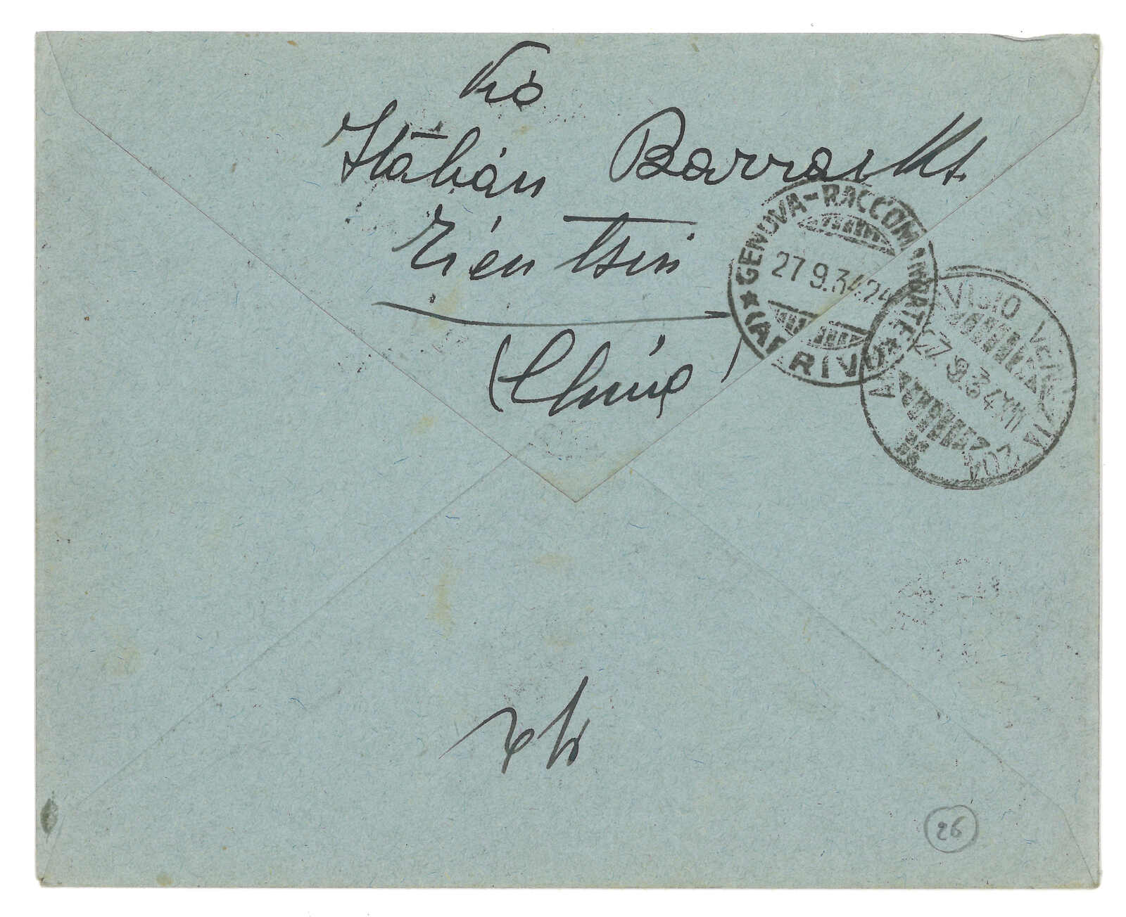 1934.9.10 意大利駐華營自天津寄熱那亞,貼世界盃20分橫五連 + 1.25里拉,銷“BATTAG ITALIANO IN CINA / TIENTSIN”日戳。9.27抵熱那亞。(Image 1)