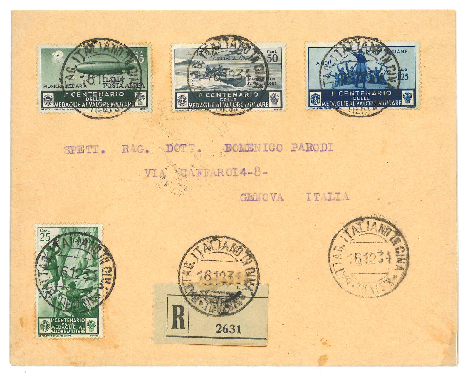 1934 Italian Battalion in Tientsin (16 Dec) to Genova, f.w. Medal of Valor + Medal of Valor airmail stamp x4, tied by "BATTAG ITALIANO IN CINA / TIENTSIN" cds, alongside with registered label. Arrived Genova (3 Jan).