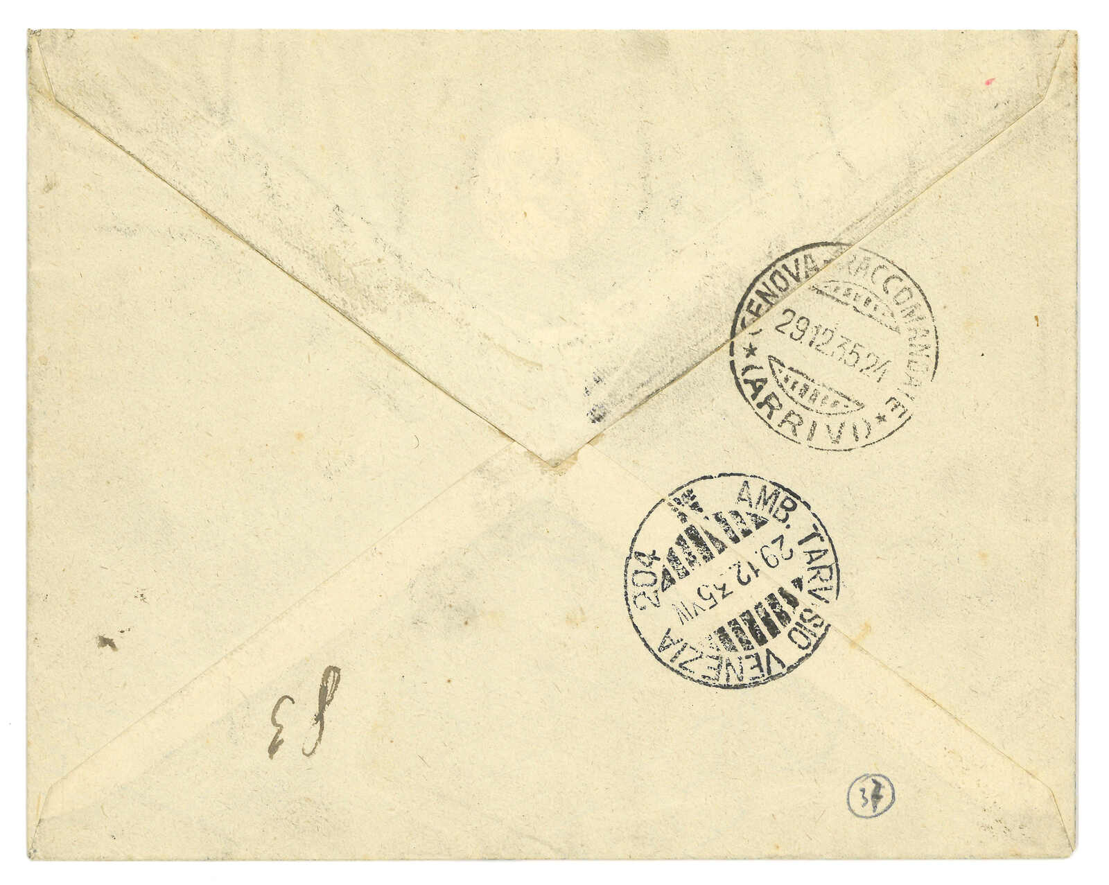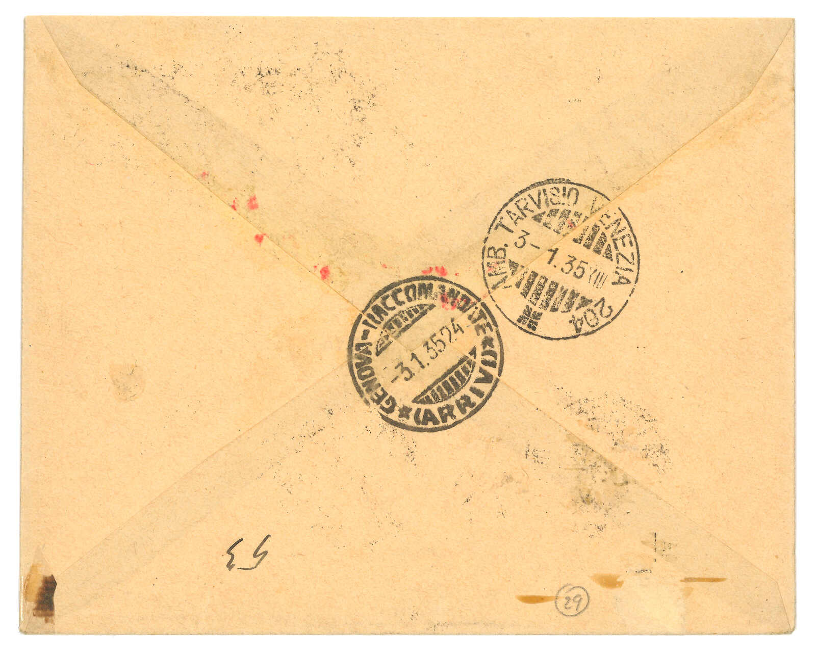 1934.12.16 意大利駐華營自天津寄熱那亞,貼貼勇敢勳章 + 勇敢勳章航空票共4枚,銷“BATTAG ITALIANO IN CINA / TIENTSIN”日戳。1.3抵熱那亞。(Image 1)