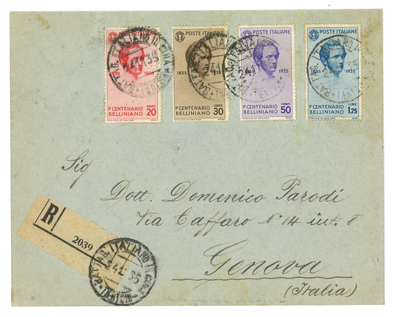1935 Italian Battalion in Tientsin (24 Nov) to Genova, f.w. 100th Anniv of the Death of Bellini 20c + 30c + 50c + 1.25lr, tied by "BATTAG ITALIANO IN CINA / TIENTSIN" cds, alongside with registered label. Arrived Genova (9