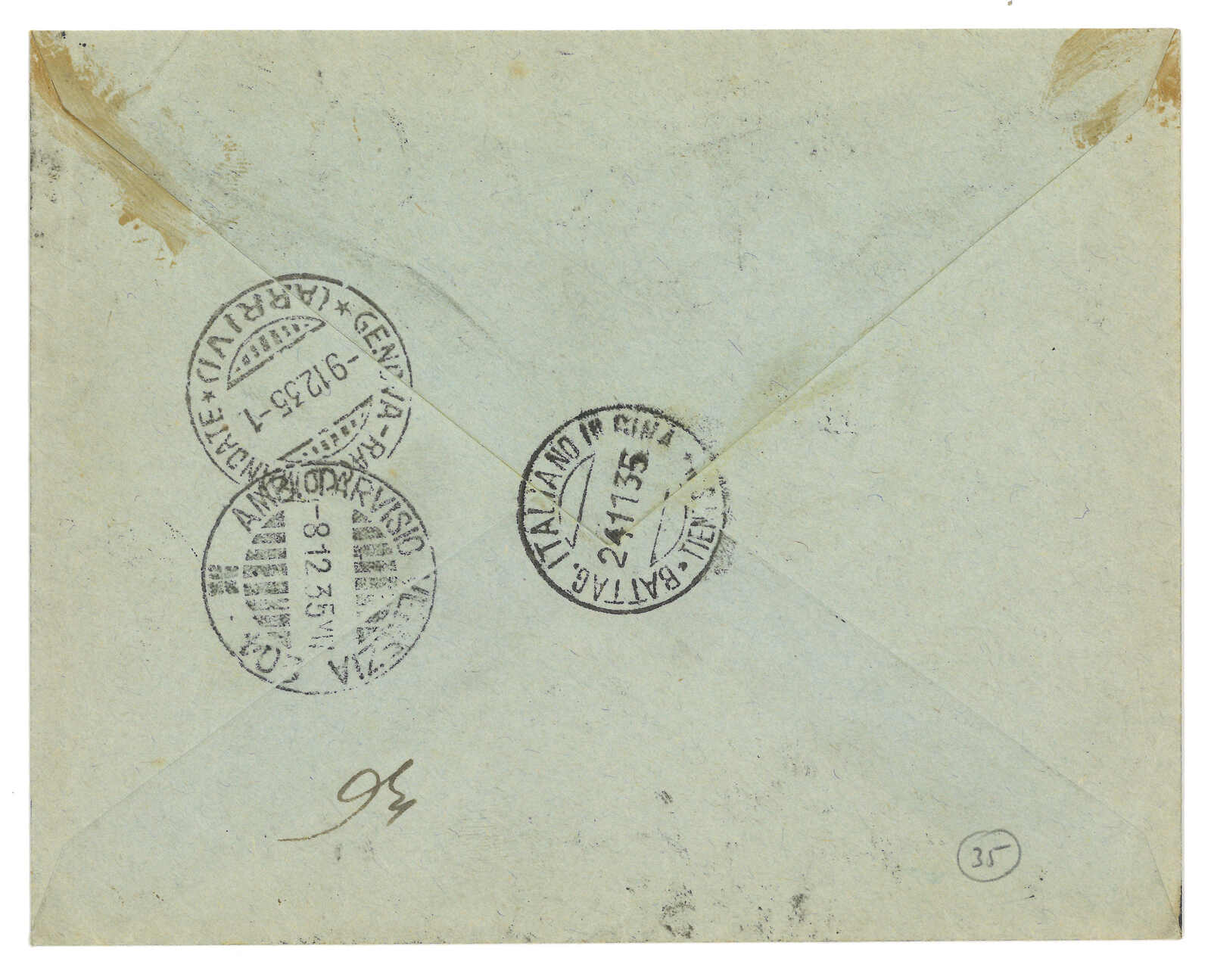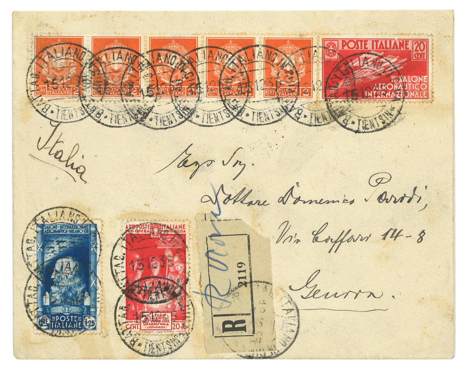 1935.12.15 意大利駐華營自天津寄熱那亞,貼普票2分橫五連 + 民兵20分 + 國際航空展20分 + 1.25里拉,銷“BATTAG ITALIANO IN CINA / TIENTSIN”日戳,旁貼掛號標籤。12.29抵熱那亞。(Image 1)