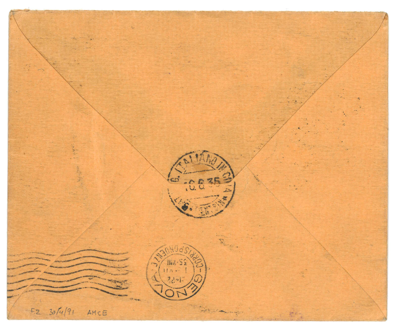 1935.6.16 意大利駐華營自天津寄熱那亞,貼大學競賽50分x2 + 快信票1.25里拉,銷“BATTAG ITALIANO IN CINA / TIENTSIN”日戳,旁貼“AGENZIA RECAPITO”轉運代理標籤。抵熱那亞。少見之快信票及轉運代理標籤。(Image 1)