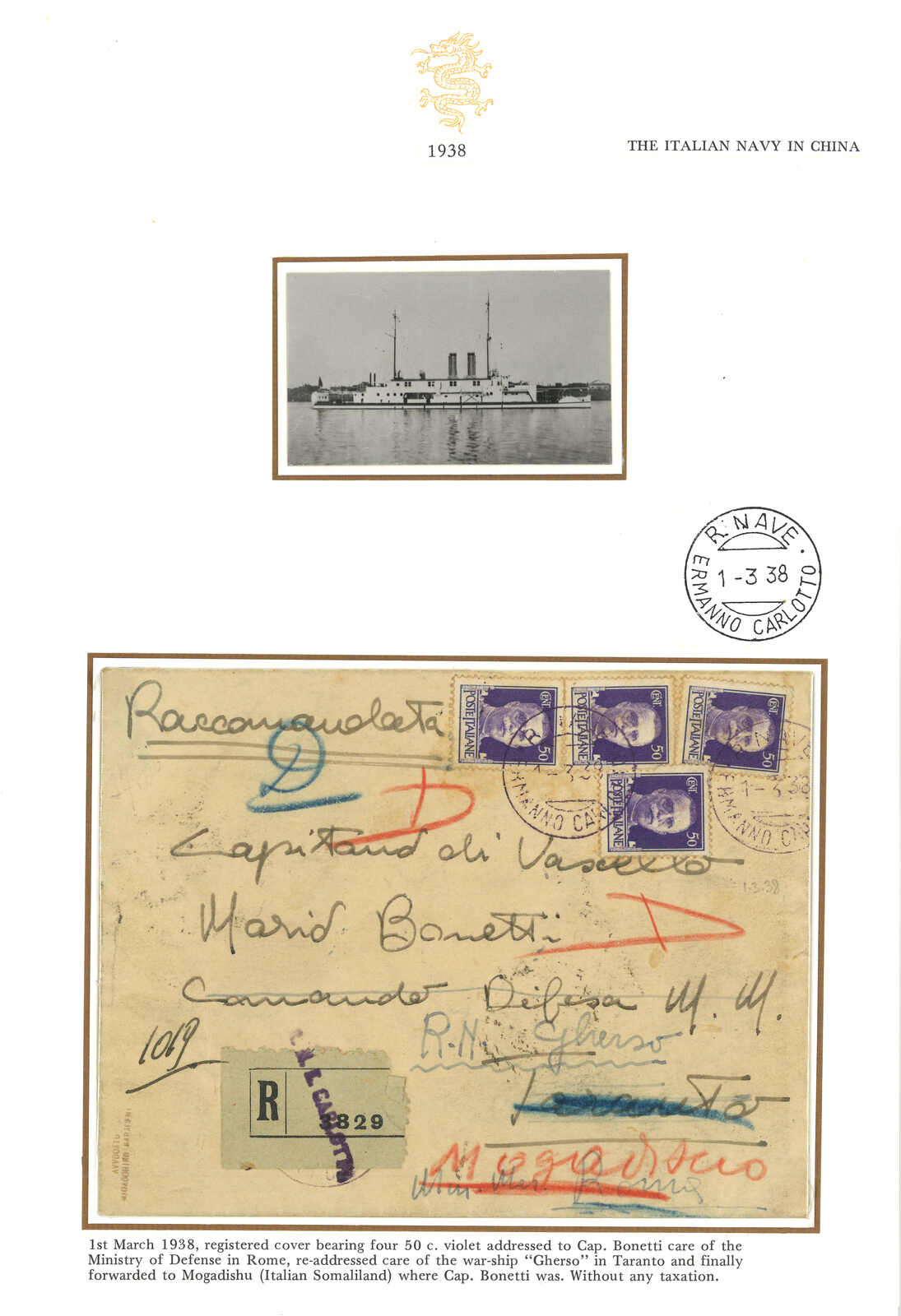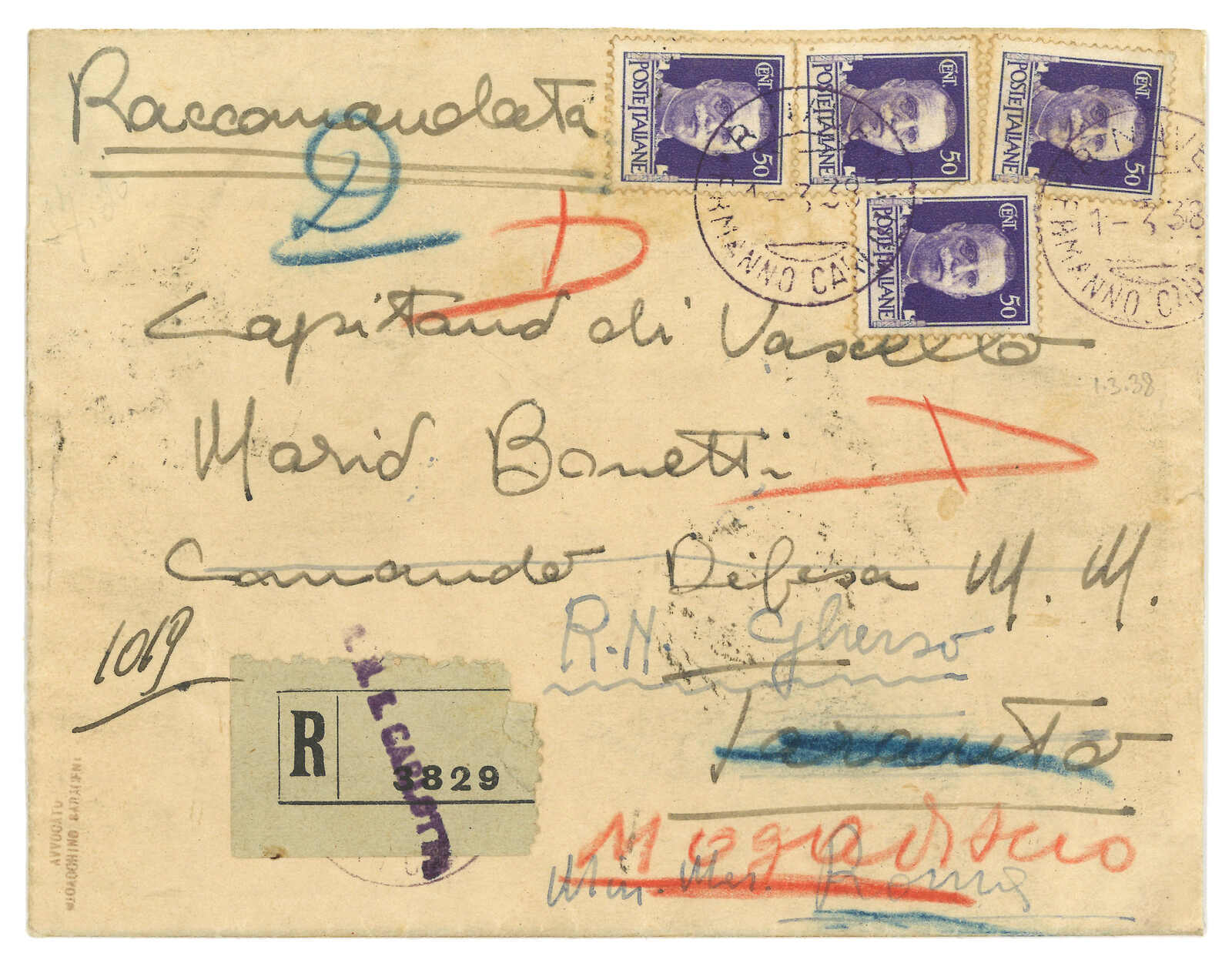 CARLOTTO”日戳,旁貼掛號標籤。3.25經布林迪西,3.25抵Tarantozxab,4.23抵摩加迪沙。極少見之中國寄意屬索馬里蘭封。 Ermanno Carlotto號本屬意大利海軍,在意大利投降後被收入日本海軍,二戰後先後收編至民國及新中國海軍。封左側被裁。(Image 1)