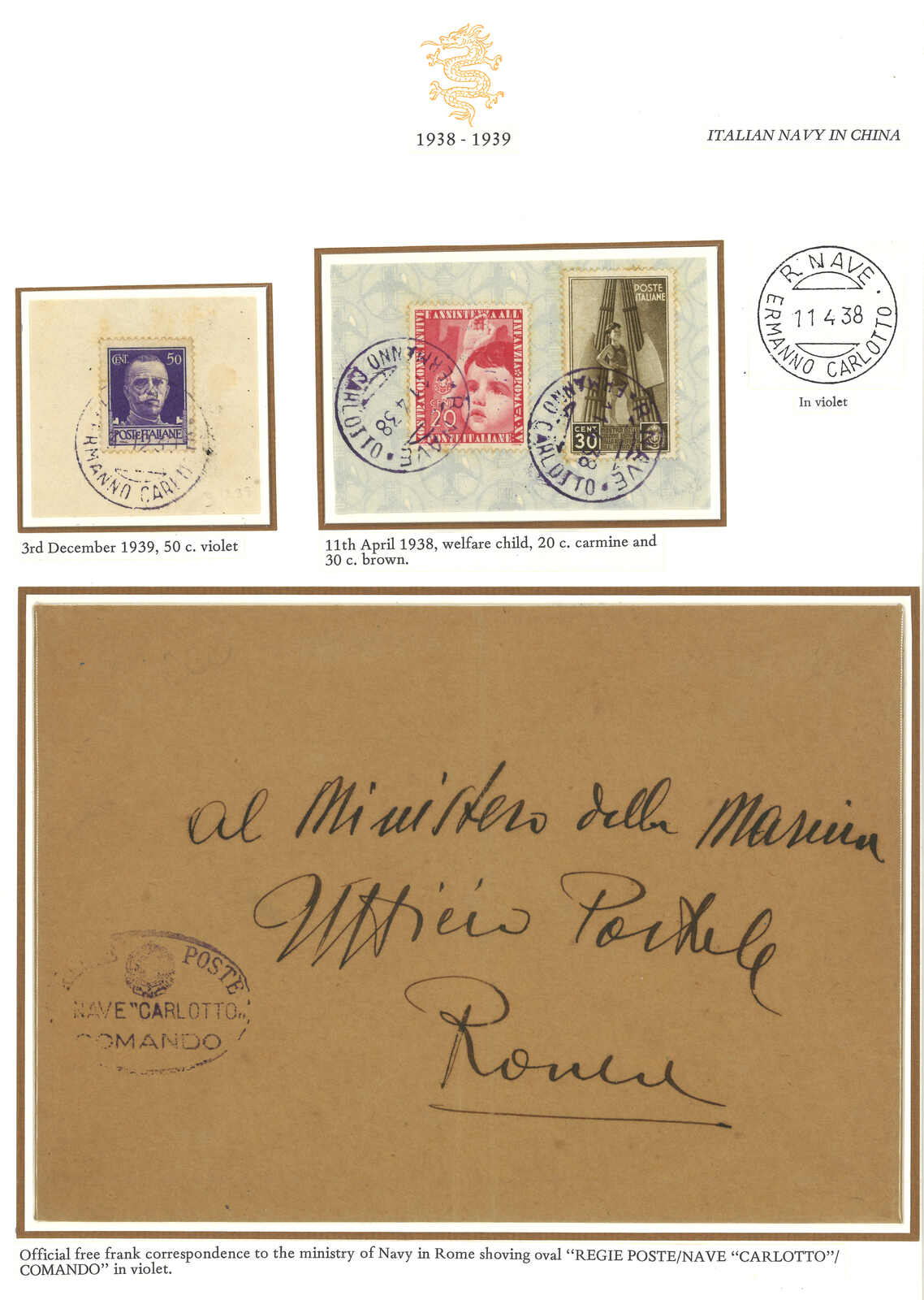 ca 1938 Italian gunboat Ermanno Carlotto to Rome, frankless, applied with scarce "R NAVE CARLOTTO / COMANDO" oval seal. Plus two stamp pieces applied with "R NAVE / ERMANNO CARLOTTO" cds. Ermanno Carlotto was a Italian river