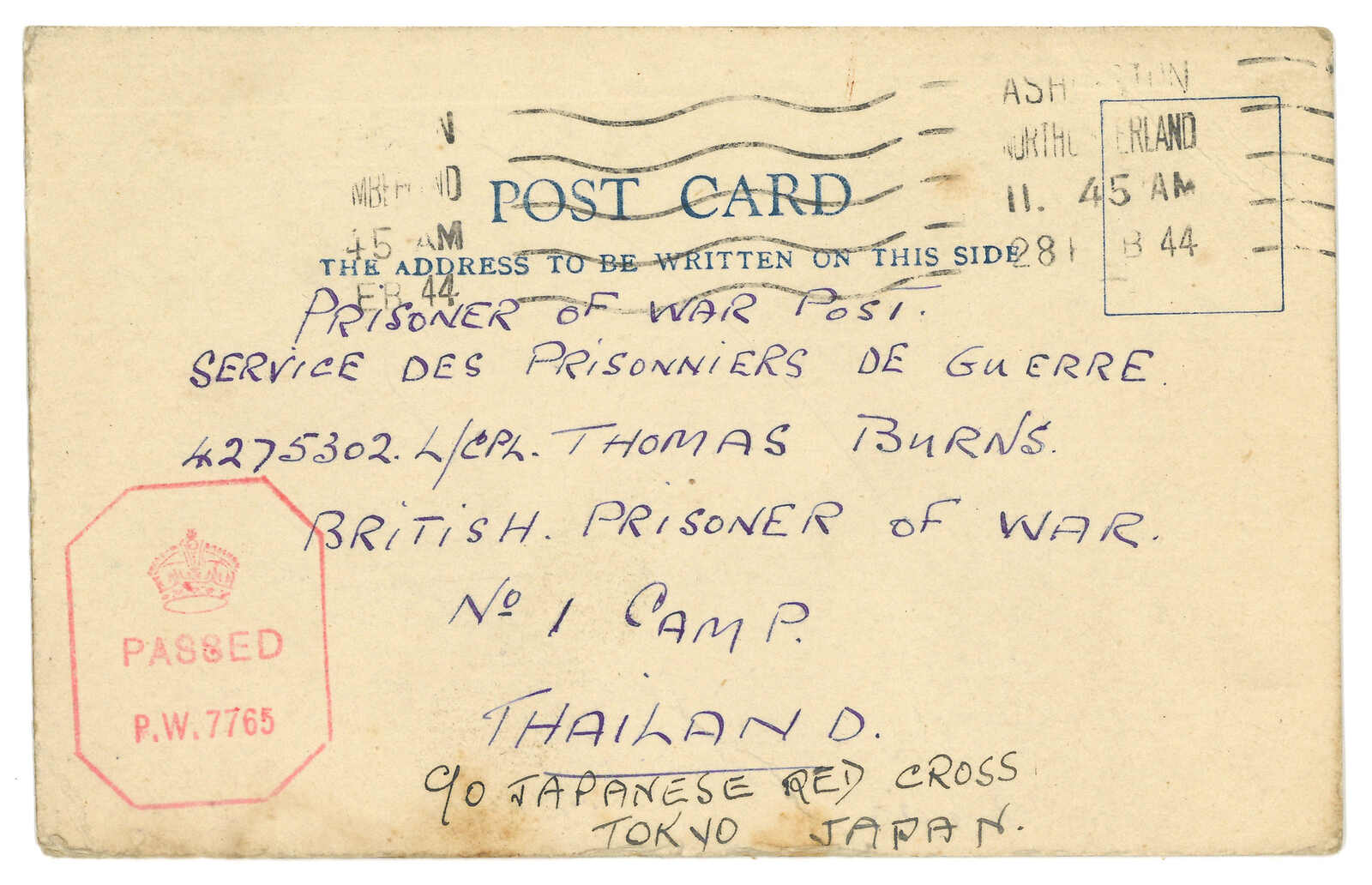 2104 cover image1944 (28 Aug) WWII POW postcard from North Ireland to a British POW Thomas Burns in Thailand, appplied with Ashington wavy line d.s and censor mark.