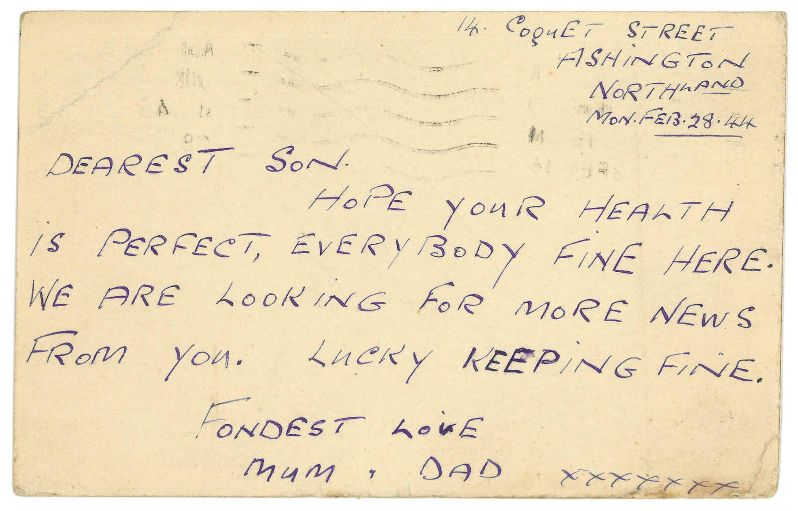 1944.8.28 二戰戰俘明信片,自北愛爾蘭寄暹羅的英軍戰俘Thomas Burns,鈐Ashintgon機戳和檢查章。(Image 1) (Image 2)