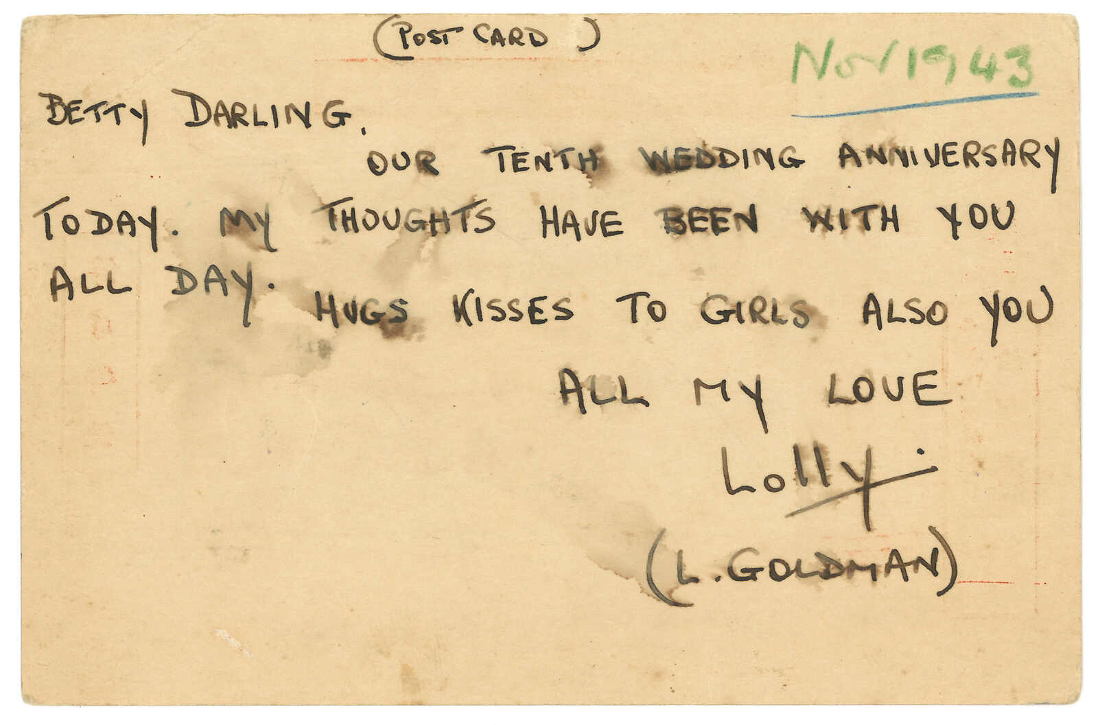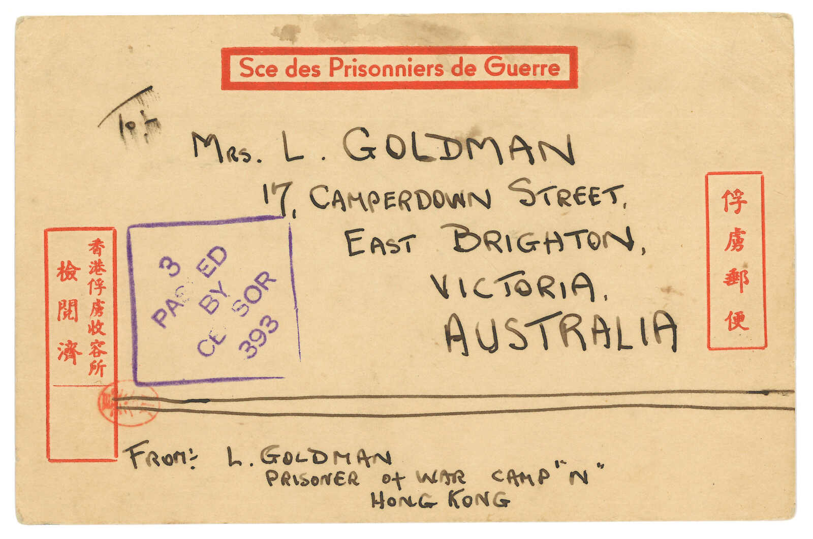 1940年代二戰戰俘明信片,由香港N營的L Goldman寄澳洲,鈐香港俘虜收容所檢查章及“PASSED BY CENSOR 393”菱形檢查章。(Image 1) (Image 2)