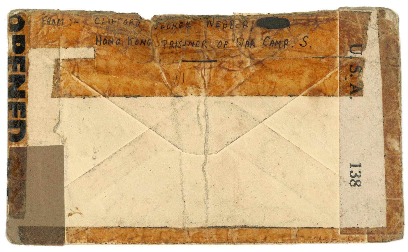 1940年代二戰戰俘檢查封,由香港S營寄英國,無貼票,鈐檢查章。封有損但以膠帶修補。唐卓敏醫生著作原件。(Image 1) (Image 2)