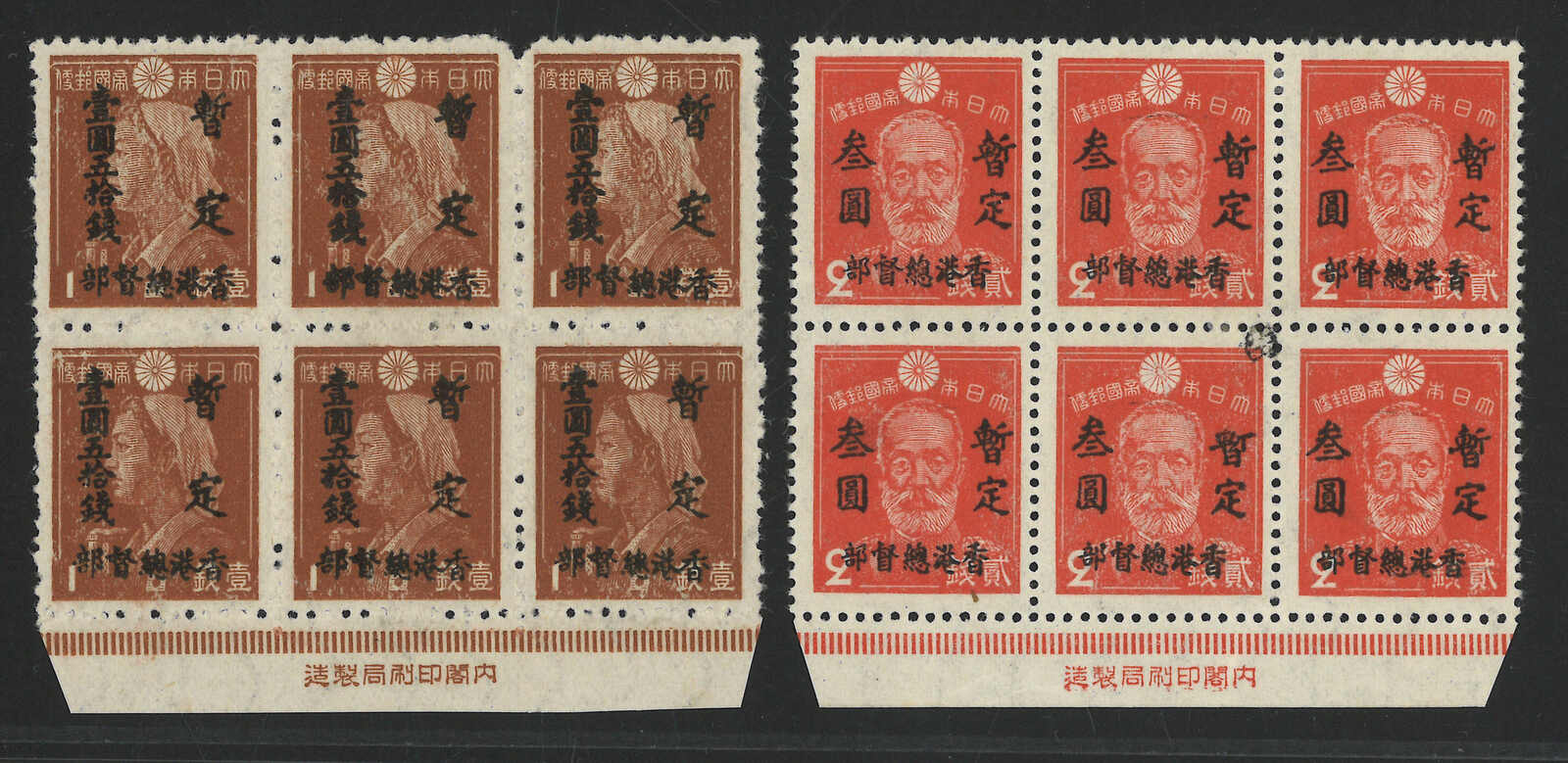 2099 */bof image1945 Japanese stamp surch Hong Kong Government 1.5 Yen/1s and 3 Yen/2s in block of 6 with bottom imprint margin (Yang J21-22), MH.