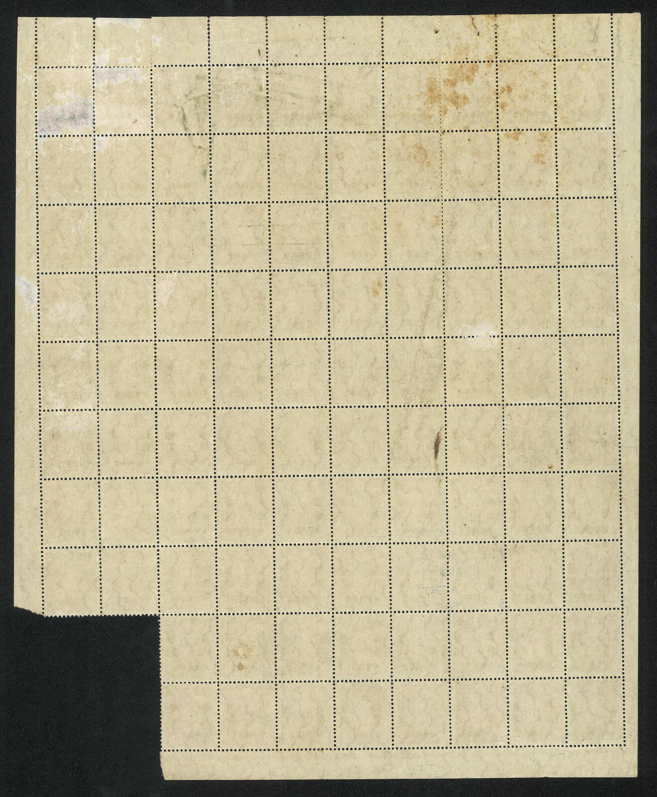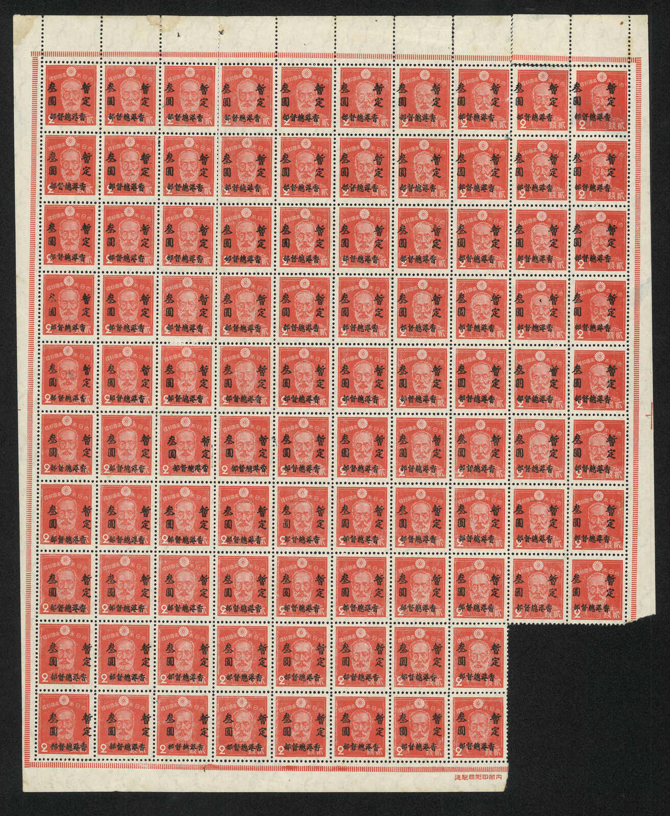 1945年日本票加蓋“香港總督部”3圓蓋2錢版票96枚新(楊目J22),背貼。邊紙帶污點,背帶軟折。展示了眾多主要加蓋特徵,如第6行3、4號位“暫定”與“香”字成一直線(楊目J22b)及其他記錄中之加蓋破版特徵。3圓蓋2錢為三款面值中唯一有版票存世以供版式研究之面值。(Image 1) (Image 2)