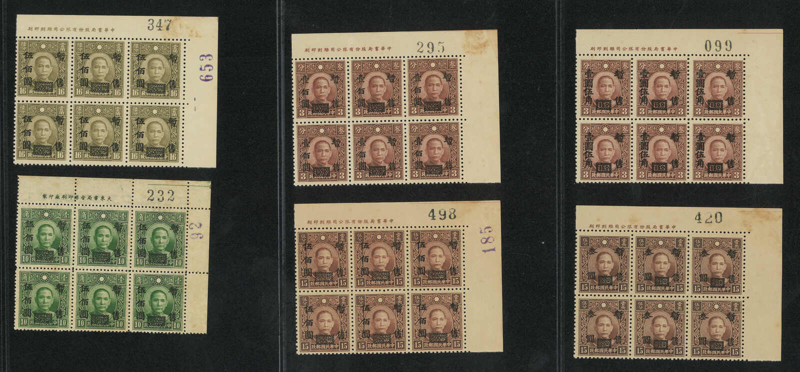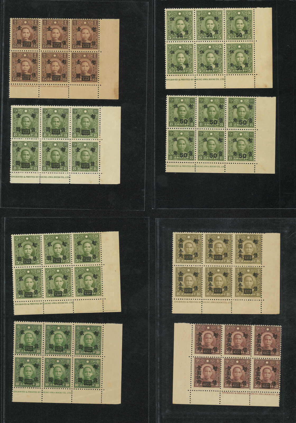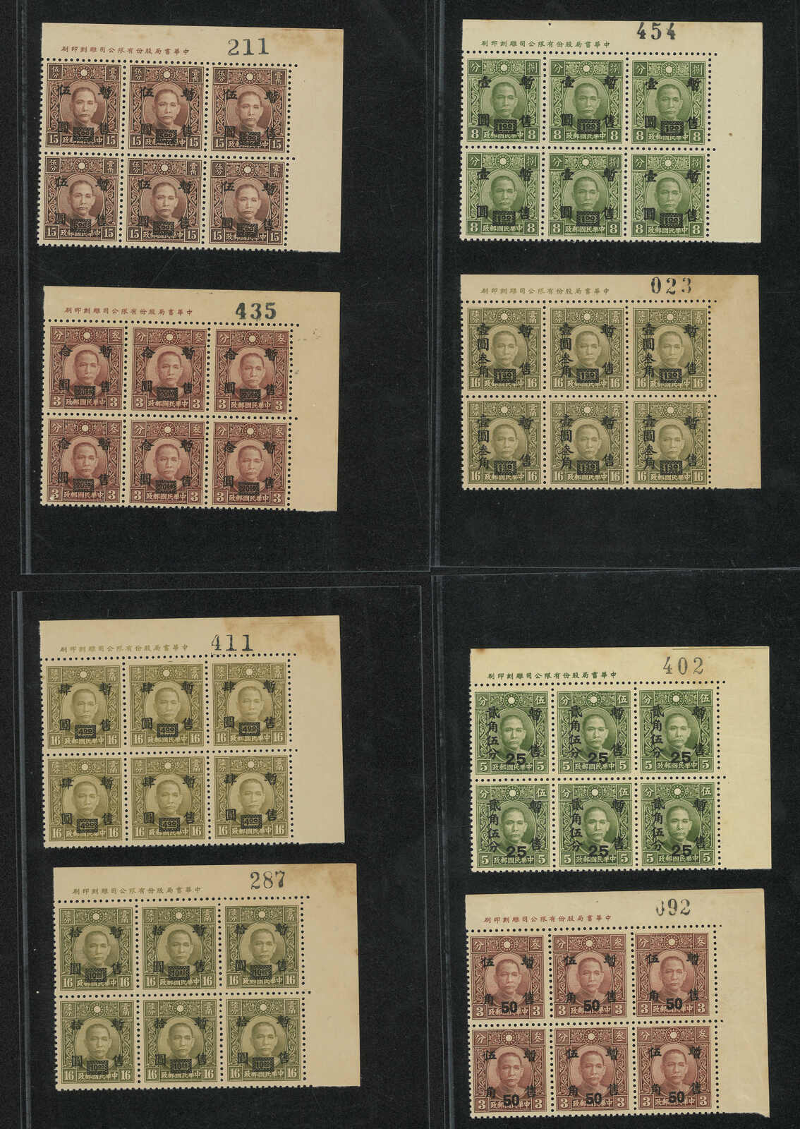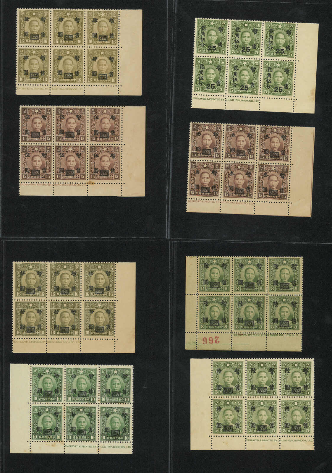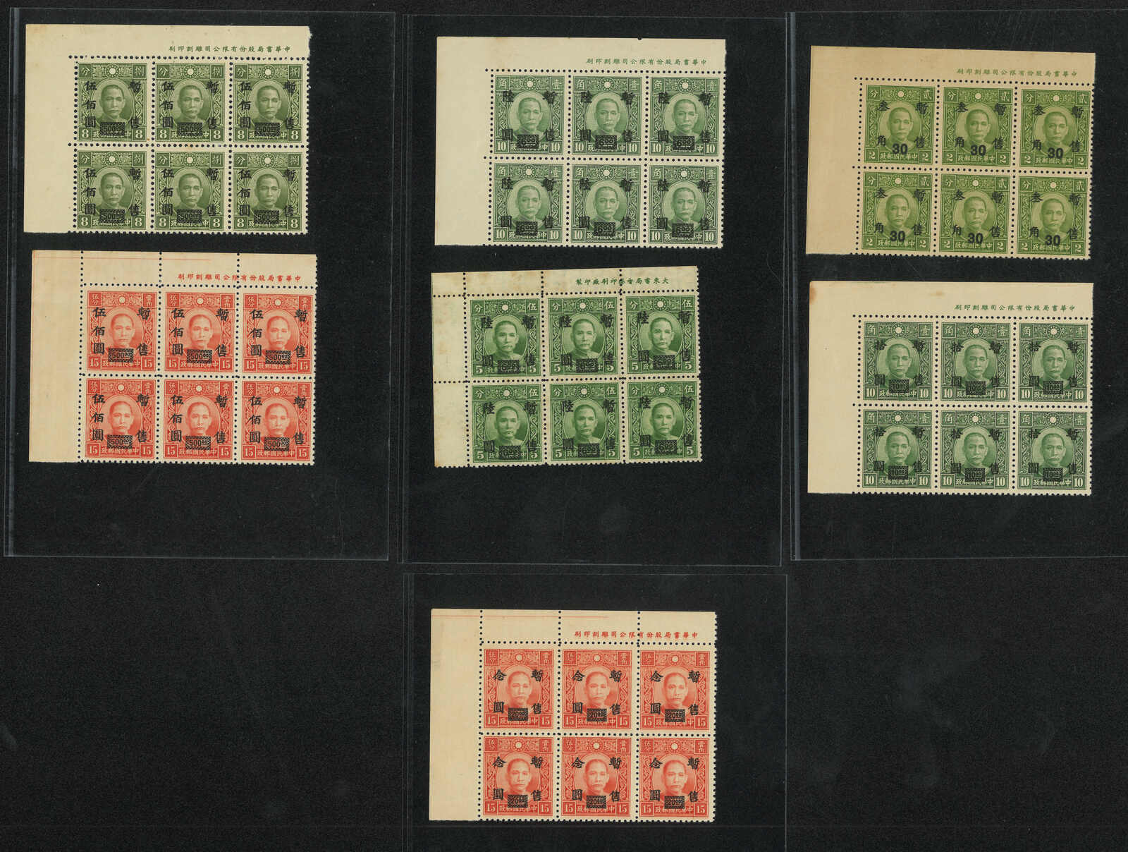 557 **/bof image1943-1945 Japanese occupied Central China surch Temporarily Sold on Chunghwa Print SYS issue in block of 6 with top right imprint corner marign, denominations from 25c to $500. MNH with original gum.