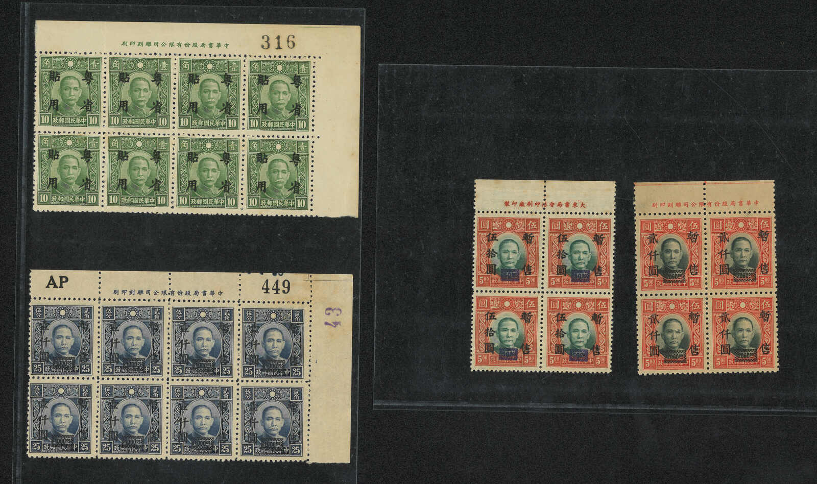 558 **/bof image1942-1945 a collection of Japanese occuiped Central China and Kwangtung ovpt issues on Chunghwa and Dah Tung Print SYS in multiples with imprint margin. MNH with original gum.
