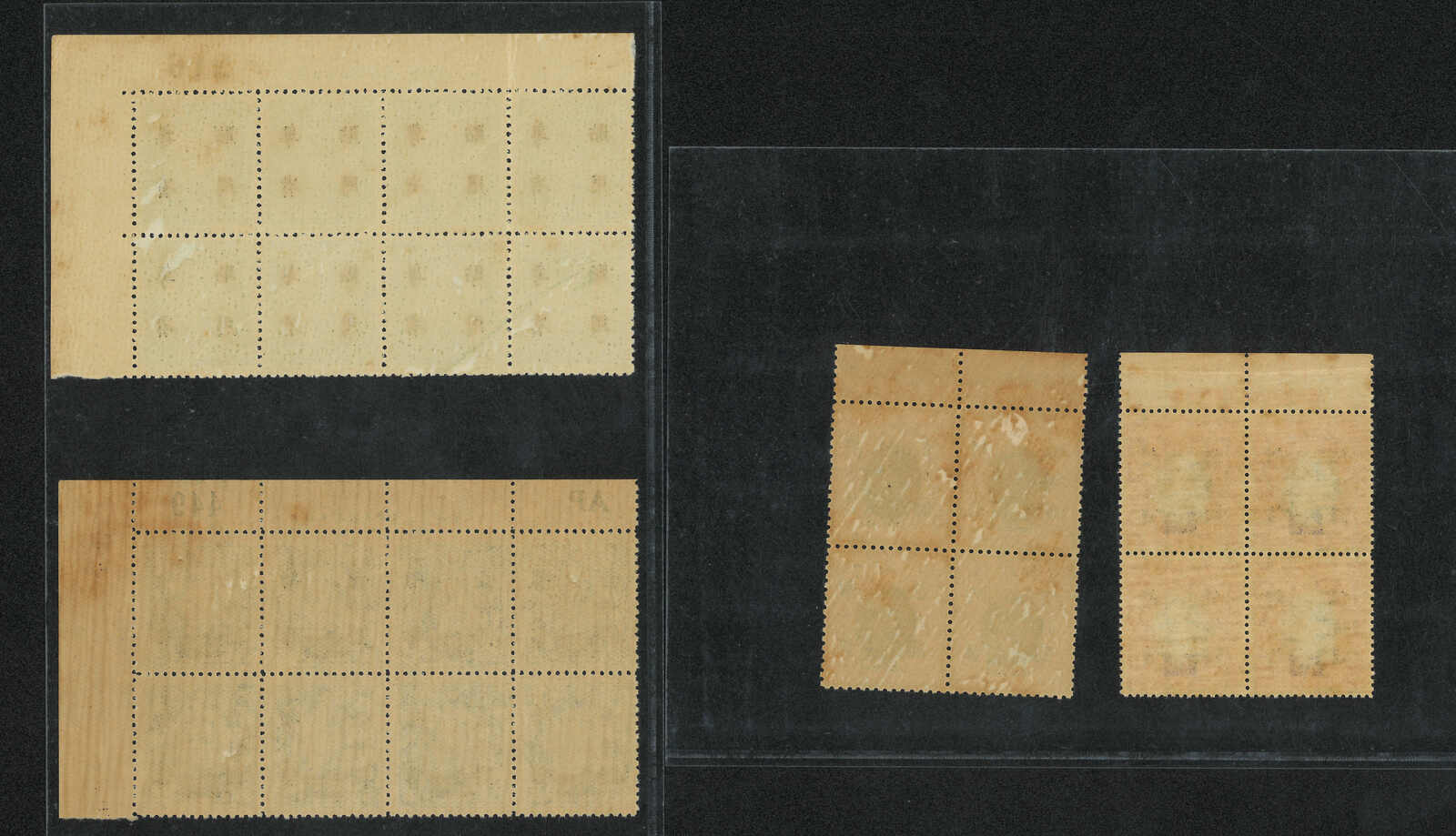1942至1945年一組4件日佔華中及廣東加蓋票方連新,蓋於中華版及大東版孫像,均帶廠銘。原膠無貼。(Image 1) (Image 2)