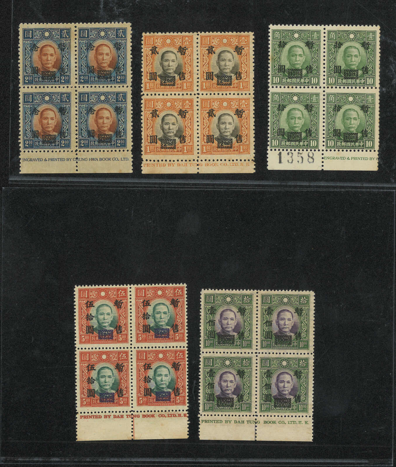554 **/bof image1943-1945 Japanese occupied Central China surch Temporarily Sold on Chunghwa Print and Dah Tung Print SYS issue in block of 6 with imprint corner marign, denominations from 25c to $10. MNH.