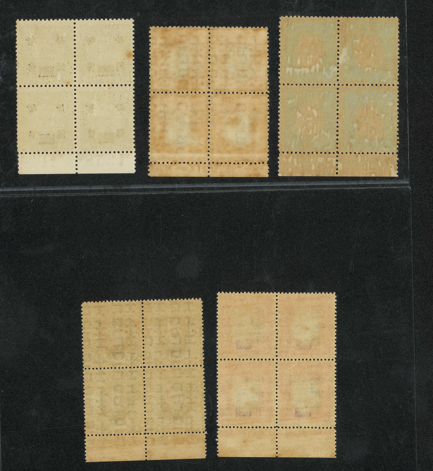 1943至1945年一組5件日佔華中改值暫售票,蓋於中華版及大東版孫像四方連新帶廠銘。面值由2元至100元。部分帶水印。原膠無貼。(Image 1) (Image 2)