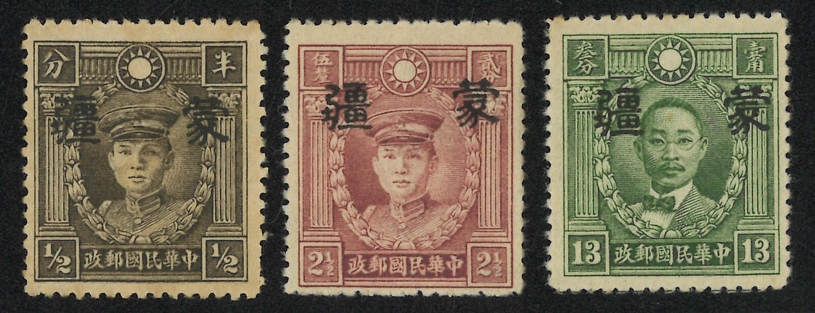 1941年北京版烈士加蓋小字“蒙疆”新全(陳目JM21-23),原膠無貼。(Image 1) (Image 2)
