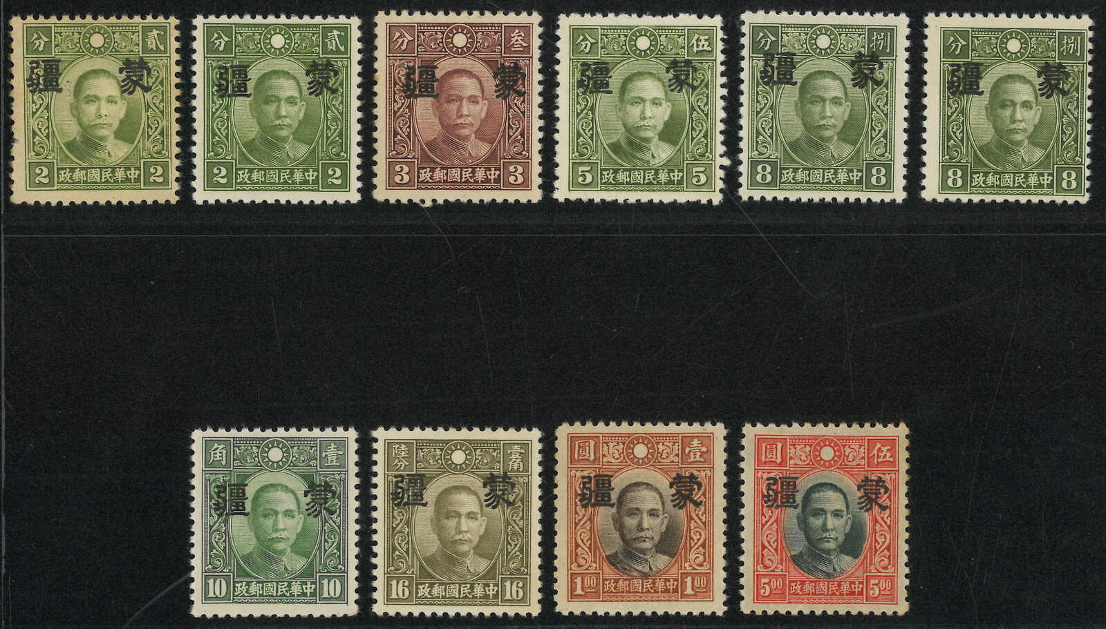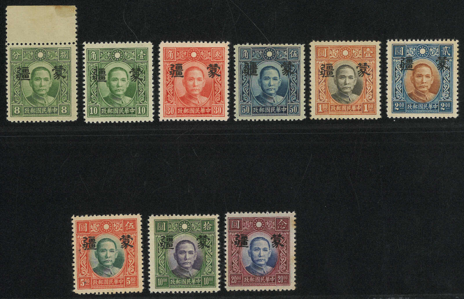 1941年中華版孫像(實心全鈕)加蓋大字“蒙疆”新票一組9枚(陳目JM48-55),欠5分,但以一枚加蓋小字5分補全。無貼。(Image 1) (Image 2)