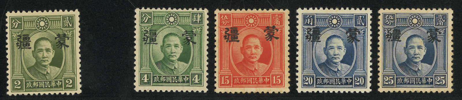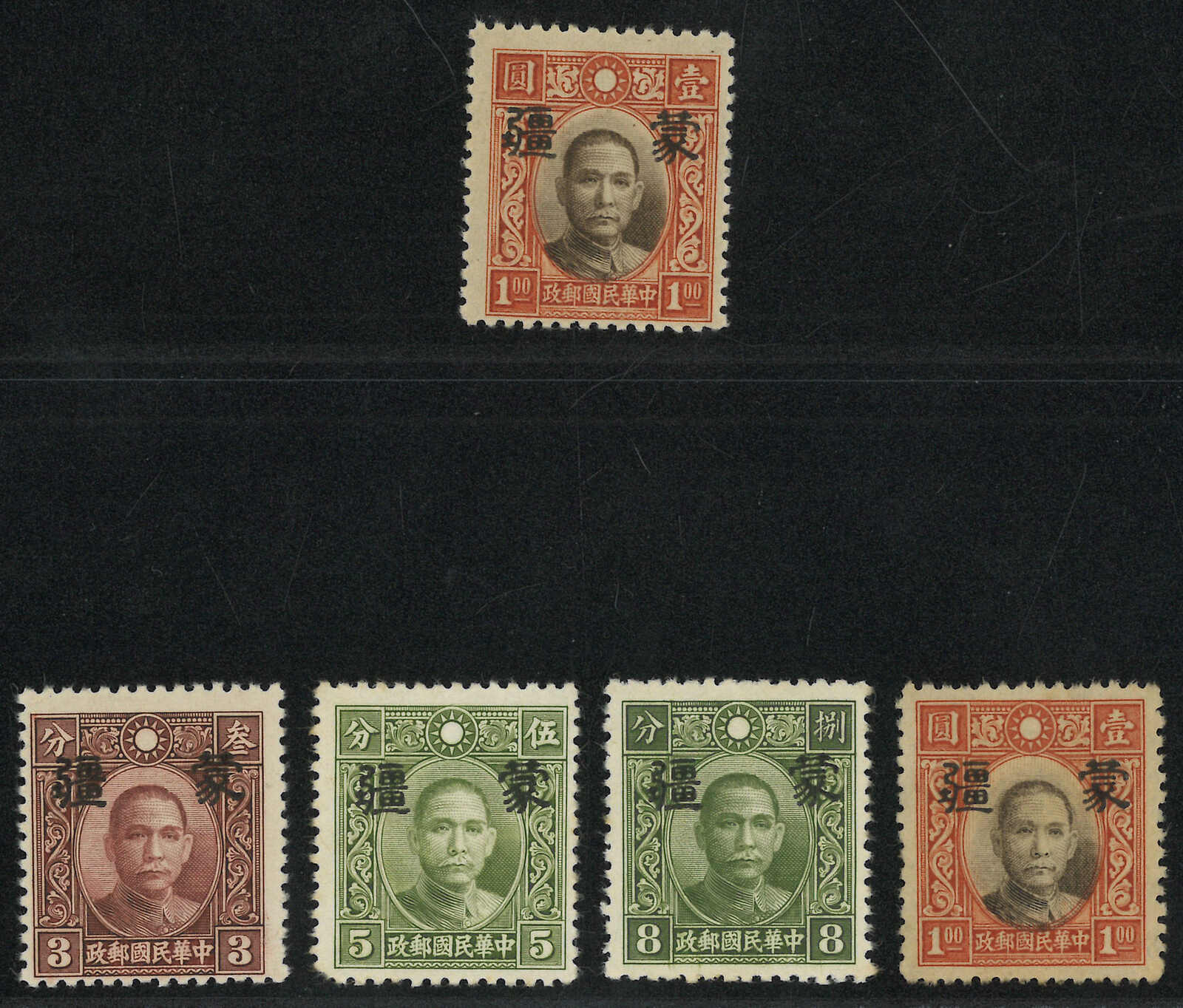1941年倫敦版孫像加蓋大字“蒙疆”新全(陳目JM43-47),包含不同型之闊窄票。原膠無貼。(Image 1) (Image 2)