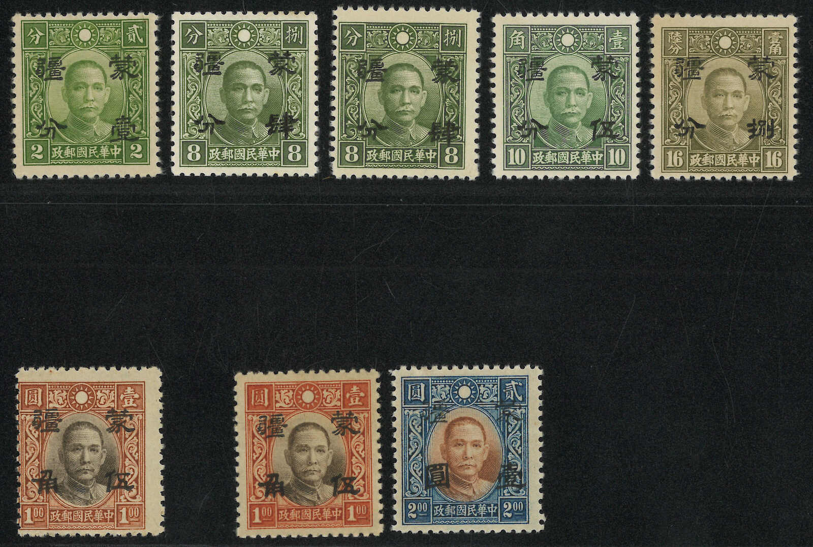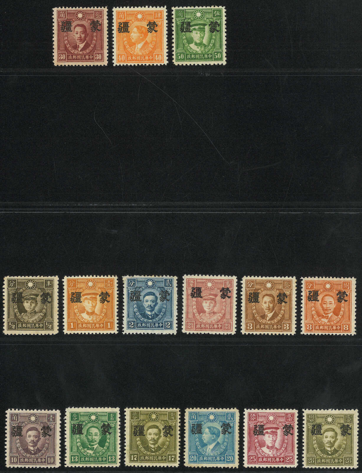 1941年香港版有水印烈士加蓋大字“蒙疆”新全(陳目JM87-101),原膠無貼/輕貼。(Image 1) (Image 2)