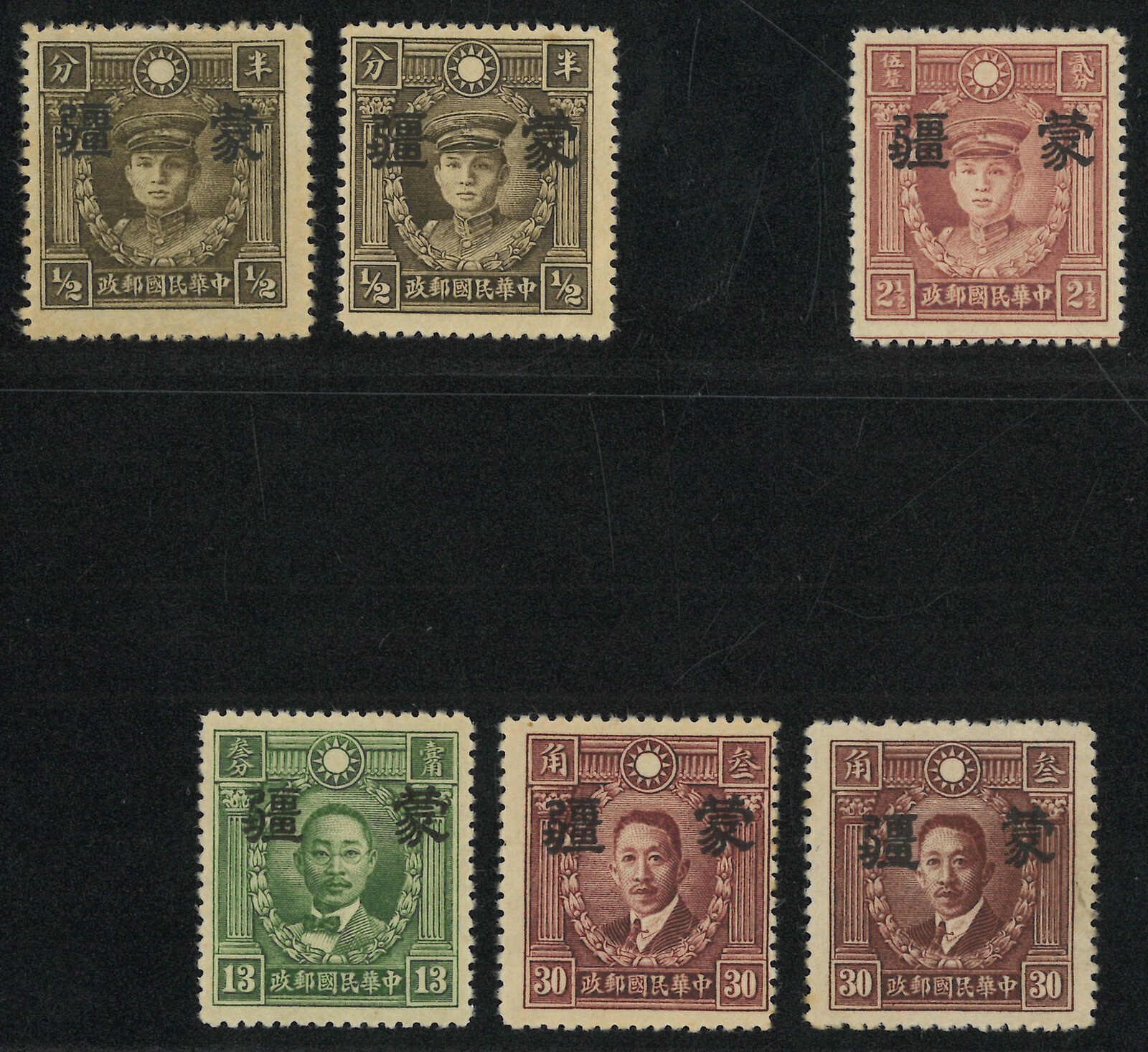 1942年中華版孫像(實心全鈕)孫像加蓋蒙疆半值票新全(陳目JM106-111),原膠無貼。(Image 1) (Image 2)