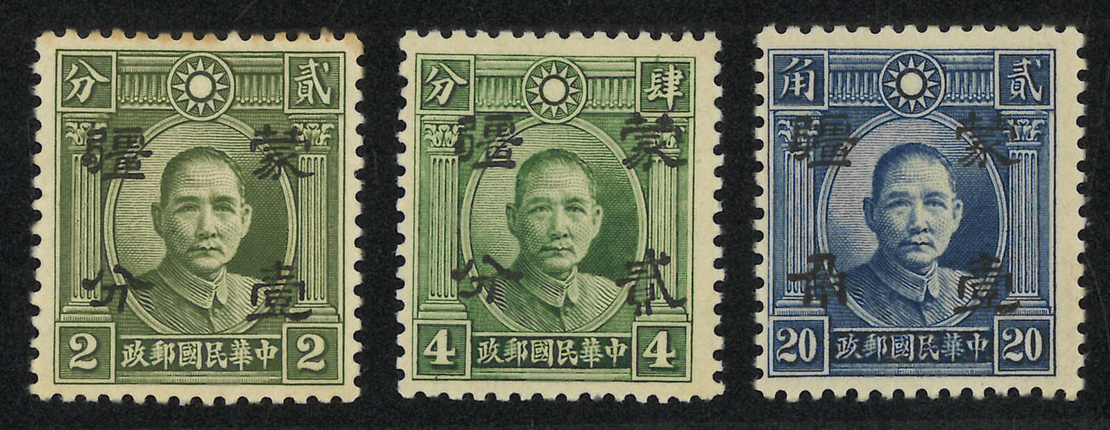 1942年倫敦二版孫像加蓋蒙疆半值票新全(陳目JM102-104),原膠無貼,背微黃點。(Image 1) (Image 2)