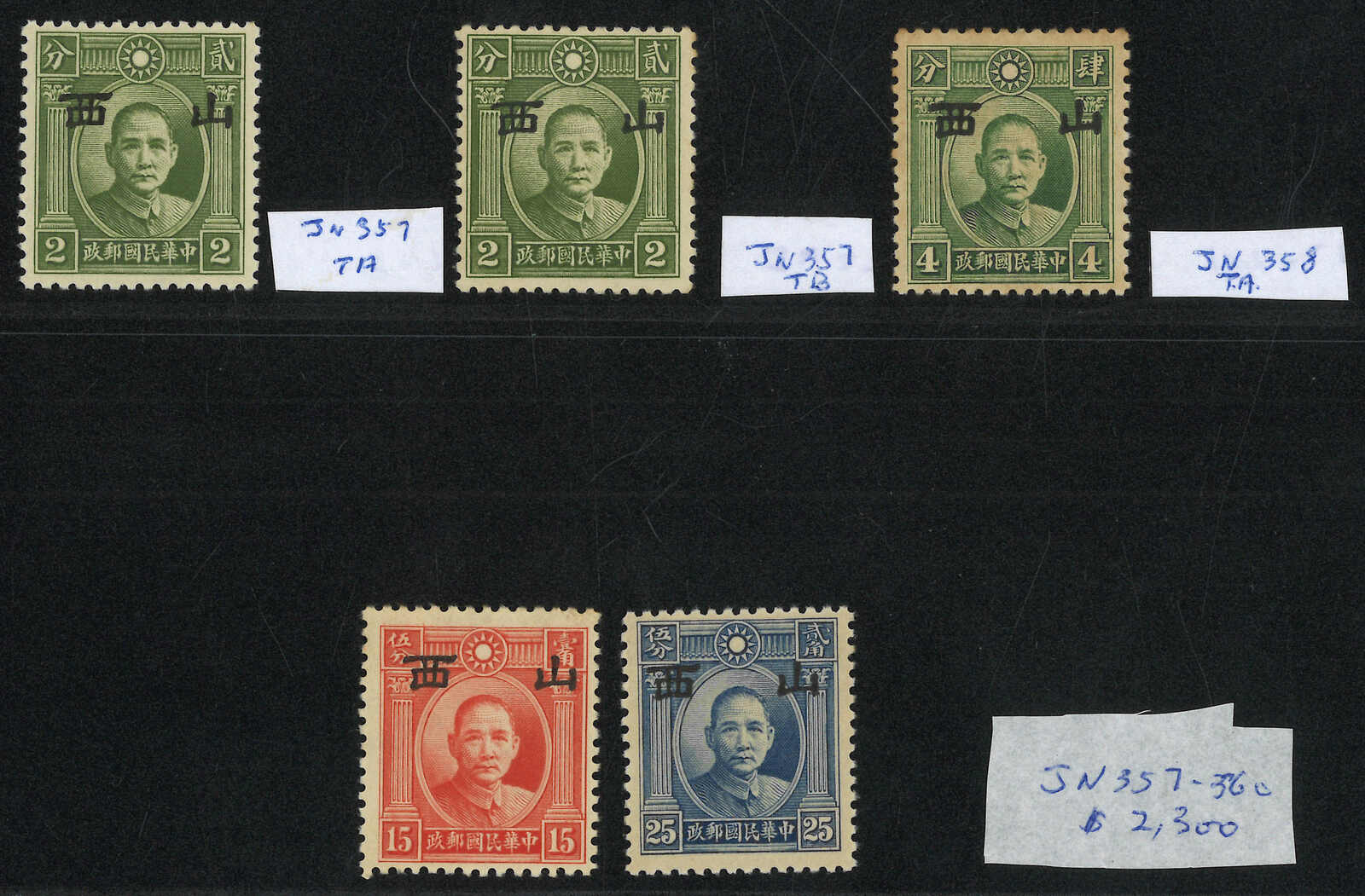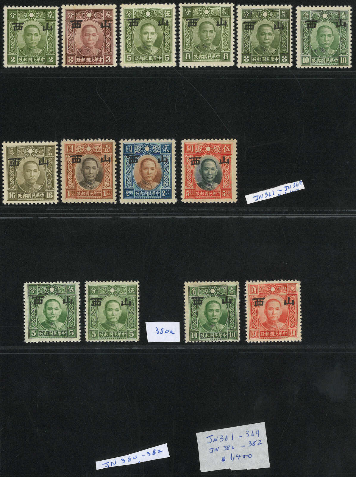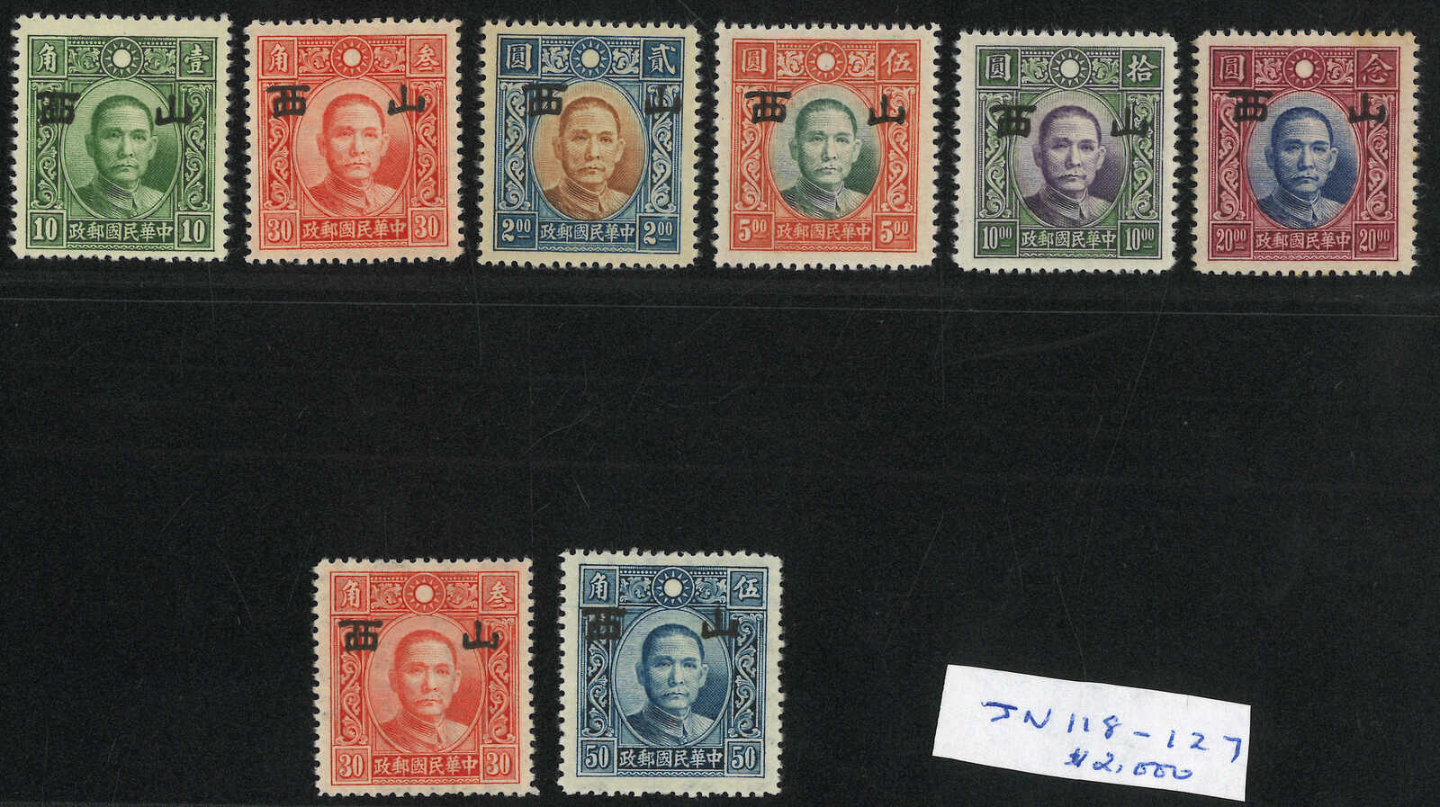 1941年中華版(實心全鈕)孫像及大東版有水印烈士加蓋大字“山西”新全(陳目JN361-369, 380-382),無貼/背貼。(Image 1) (Image 2)
