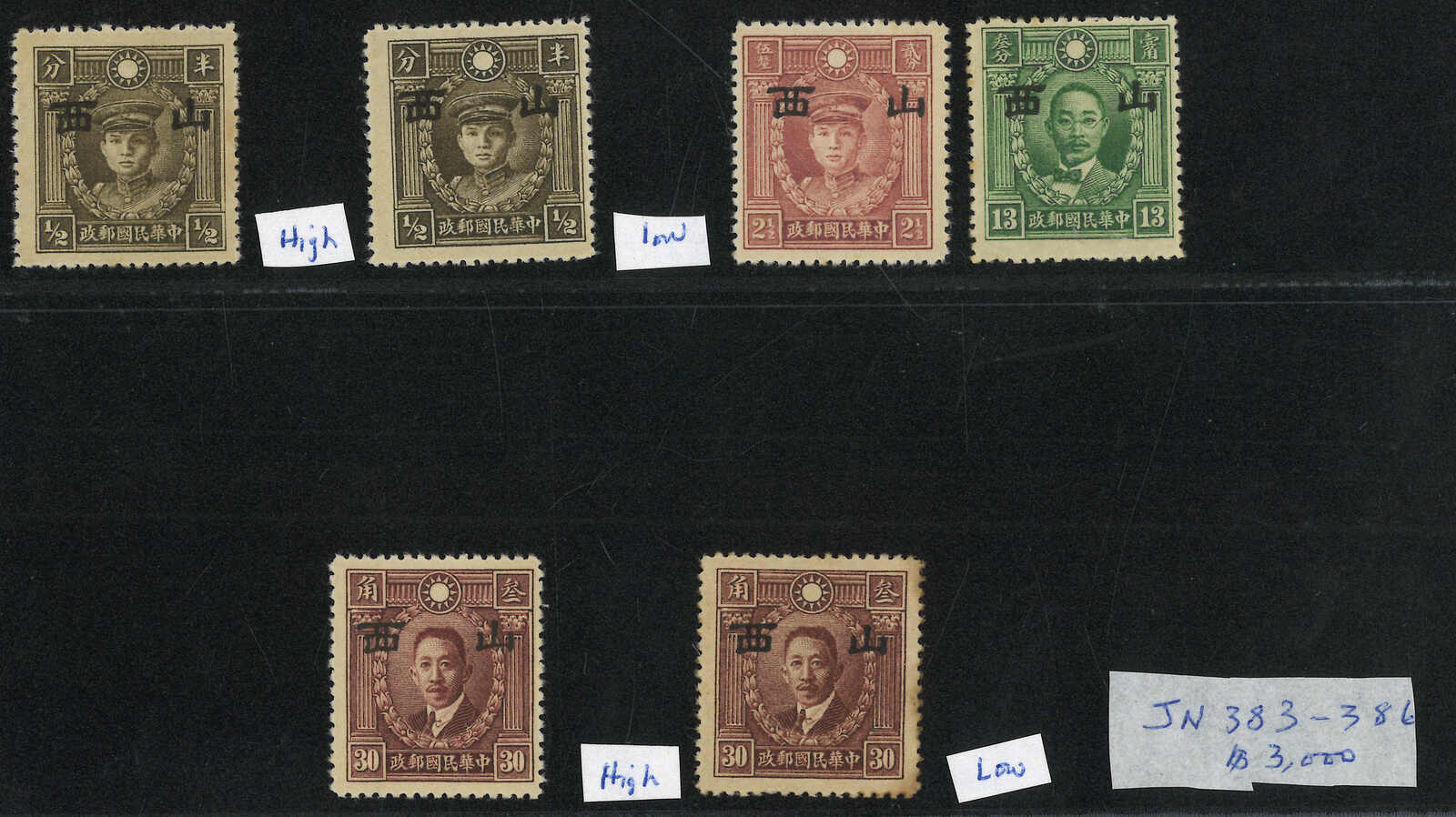 481 ** image1941 Peking Print Martyrs ovpt. "Shansi" in large character complete set (Chan JN383-386), containing low and high stamps. MNH. Slight toning on reverse.
