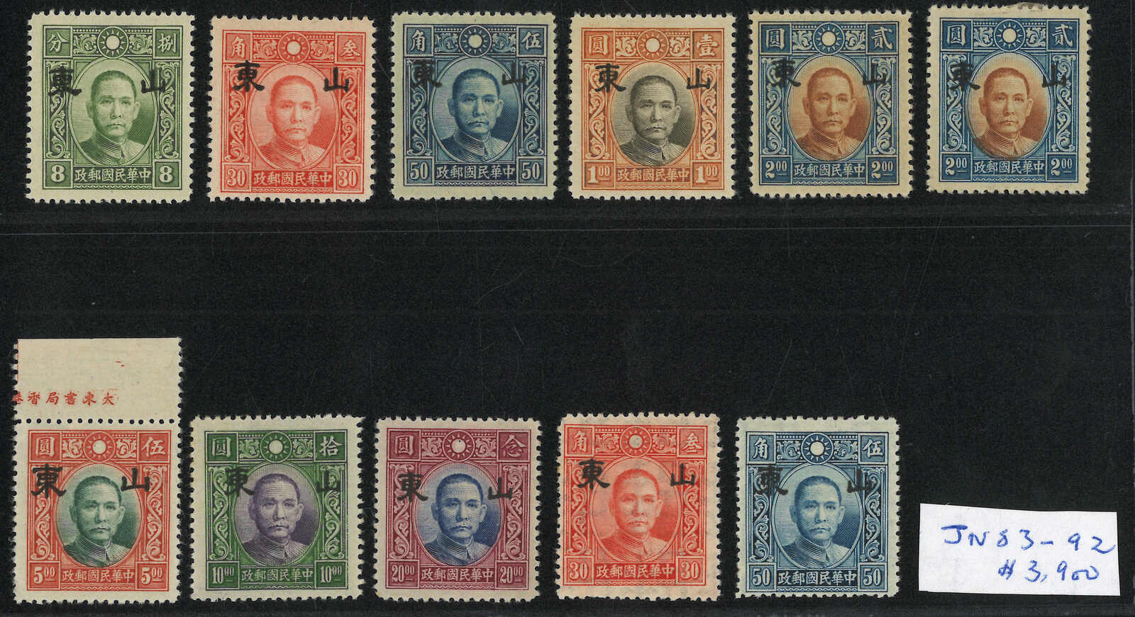 1941年大東版無水印及有水印孫像加蓋小字“山東”新全(陳目JN83-92),多附一枚2元。無貼/背貼。(Image 1) (Image 2)