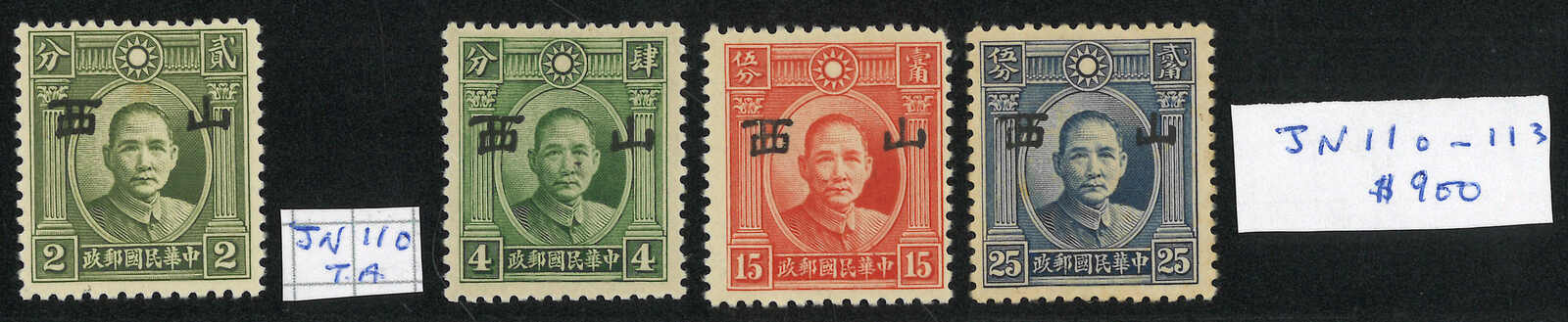 1941年倫敦二版孫像加蓋小字”山西”新全(陳目JN110-113),包含2分窄票C型。原膠無貼。(Image 1) (Image 2)