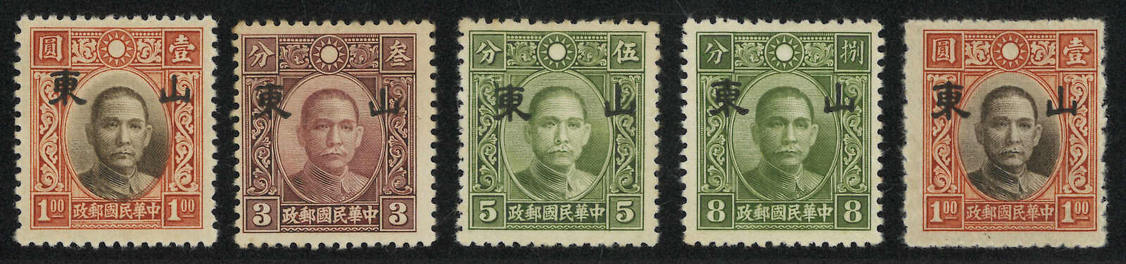 1941年中華版孫像(空心全鈕及實心全鈕)加蓋小字“山東”新全(陳目JN78-82),無貼/背貼。(Image 1)