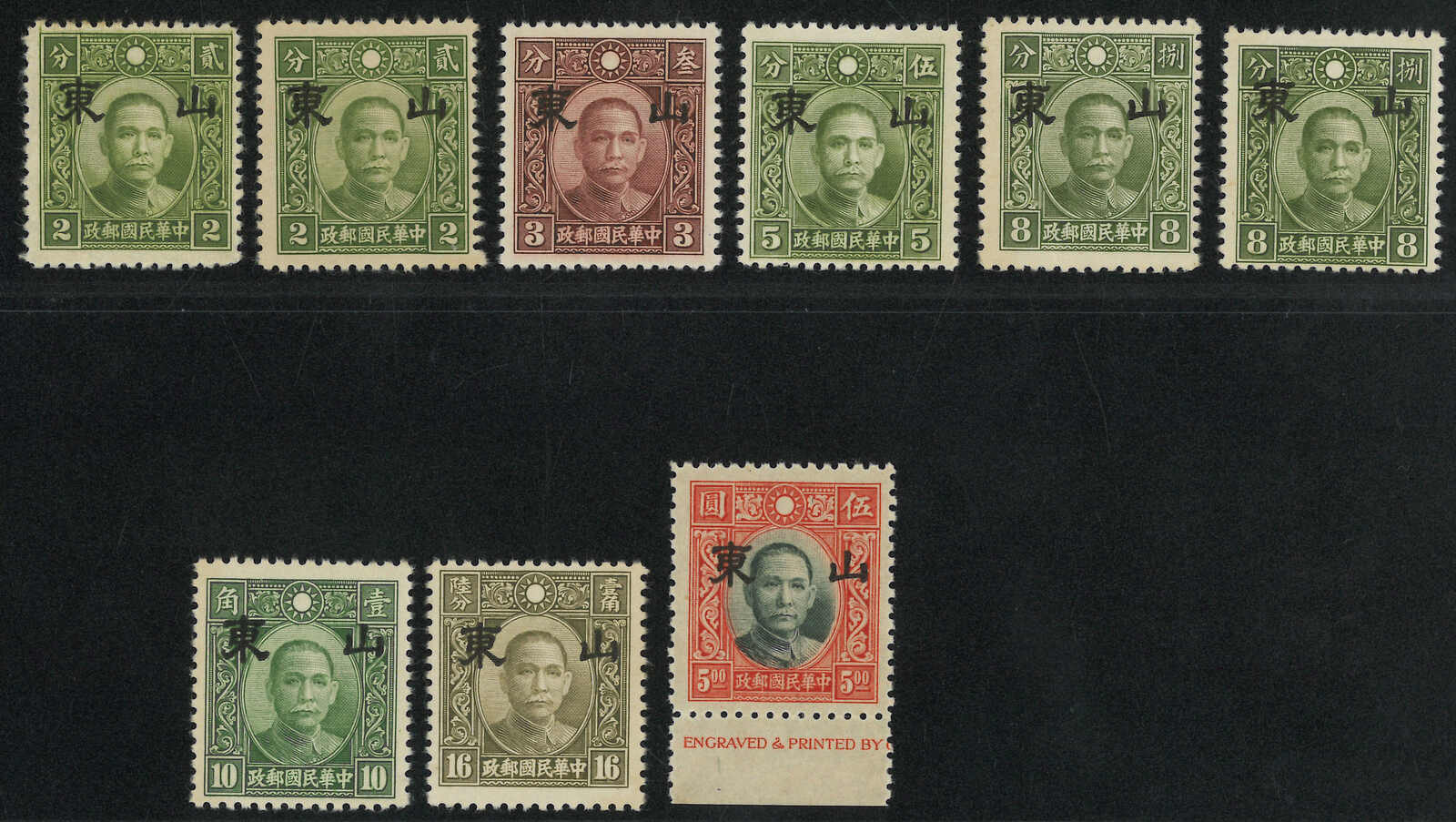 1941年大東版無水印孫像加蓋小字“山東”新票9枚(陳目JN316-325),欠8分,否則齊全。無貼/背貼。(Image 1)