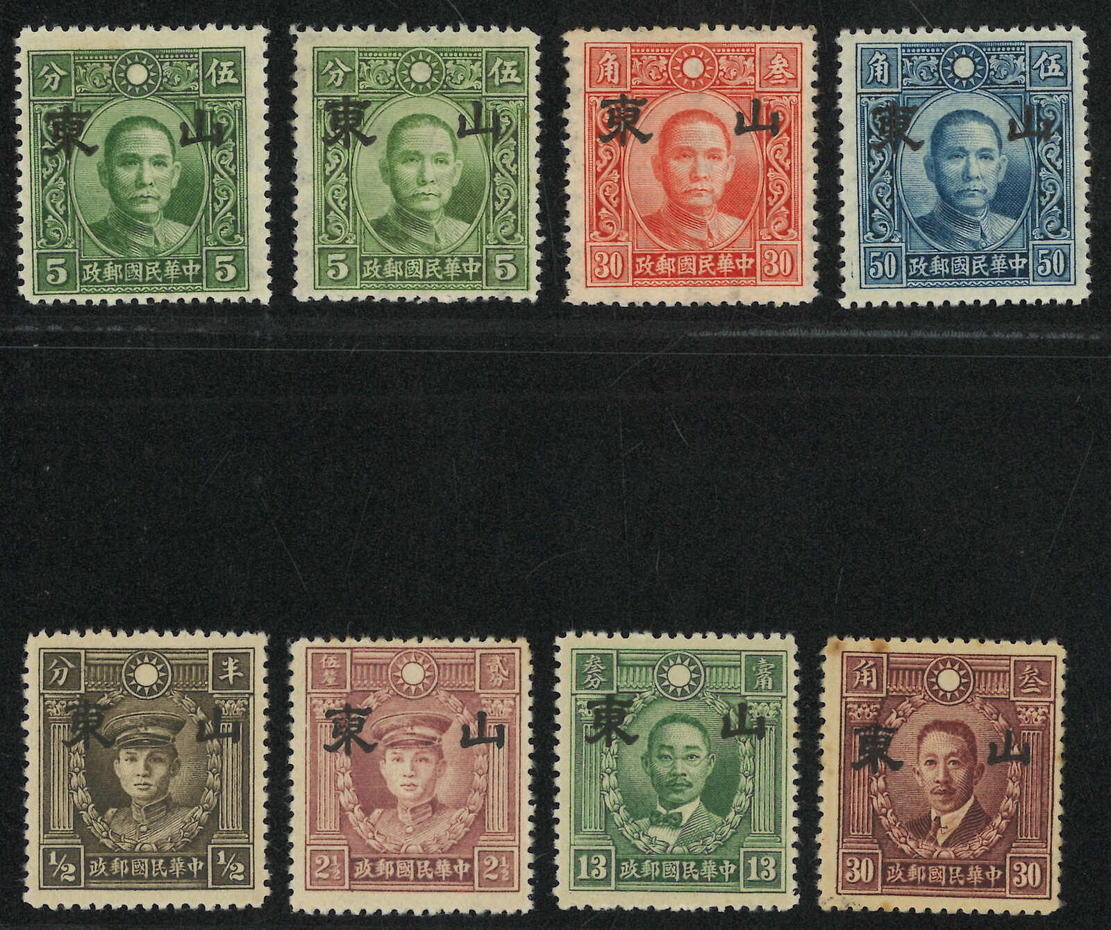 1941年大東版有水印孫像及北京版烈士加蓋大字“山東”新票8枚(陳目JN326-333),欠孫像1角,但多附一枚5分。無貼/輕貼。(Image 1)