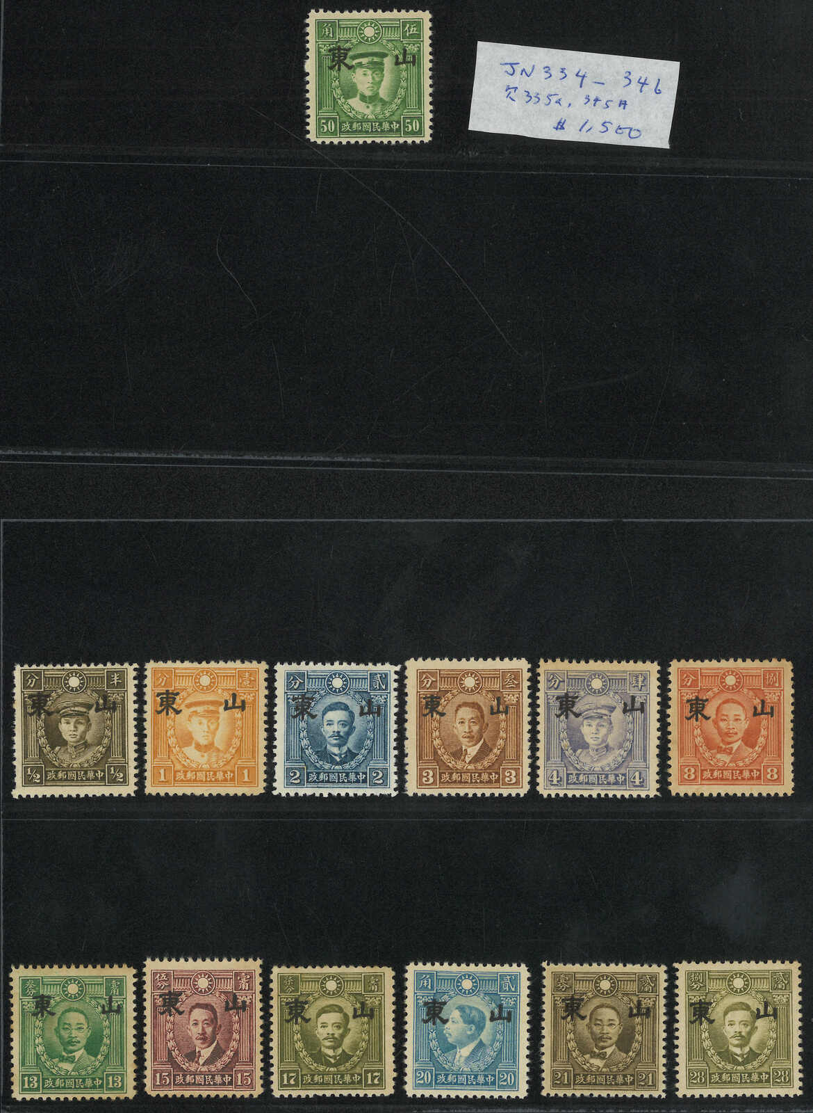 1941年香港版無水印烈士加蓋大字“山東”新票13枚(陳目JN334-346),欠政字不連1分及3角,否則齊全。無貼/輕貼。(Image 1)