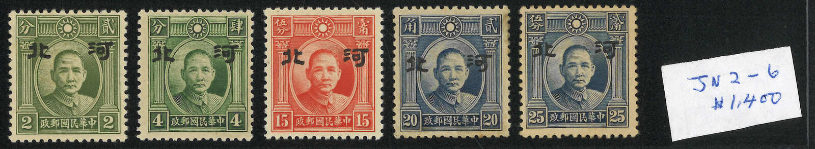 1941年中華版孫像(空心全鈕及實心全鈕)加蓋小字“河北”新票6枚(陳目JN7-12),欠3元但多附一枚5元。背貼。(Image 1)