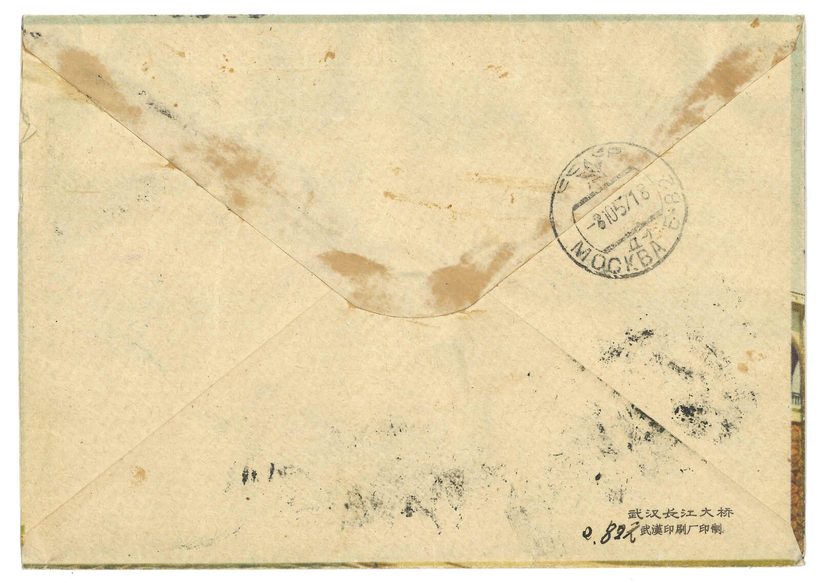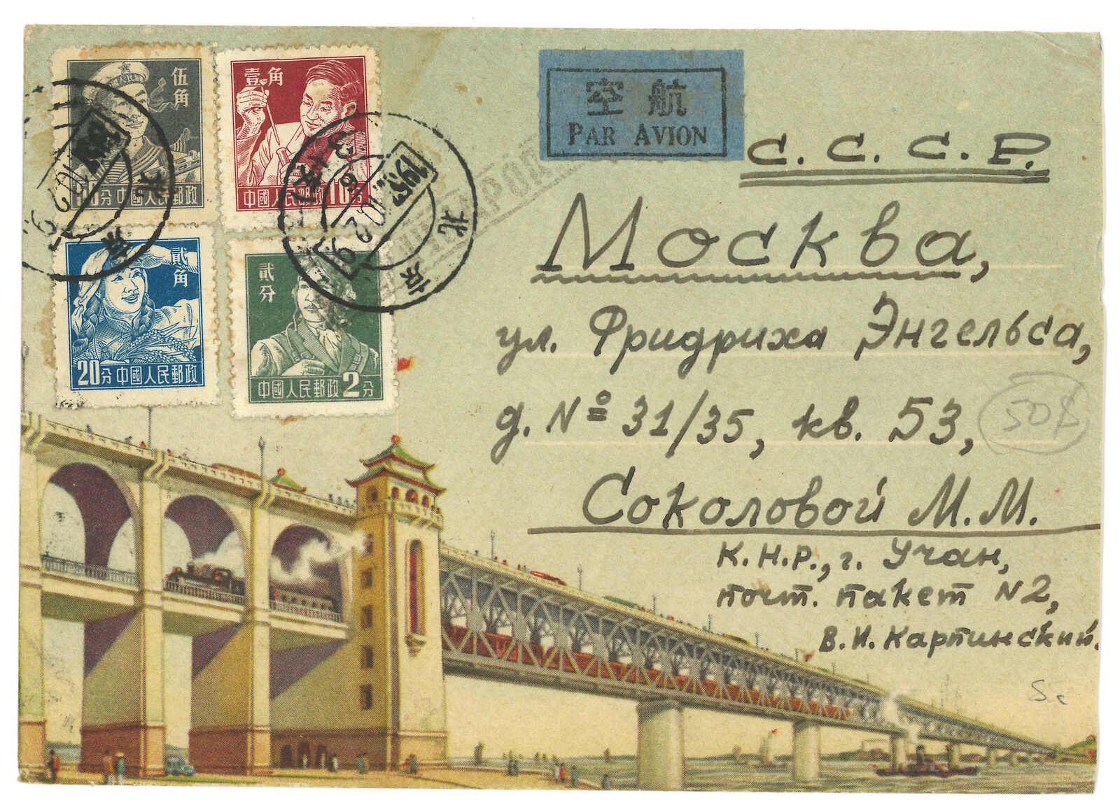 1953.10.2 北京寄莫斯科。長江大橋美術航空封,貼普8工農兵4枚,銷北京日戳。10.3抵莫斯科。(Image 1)