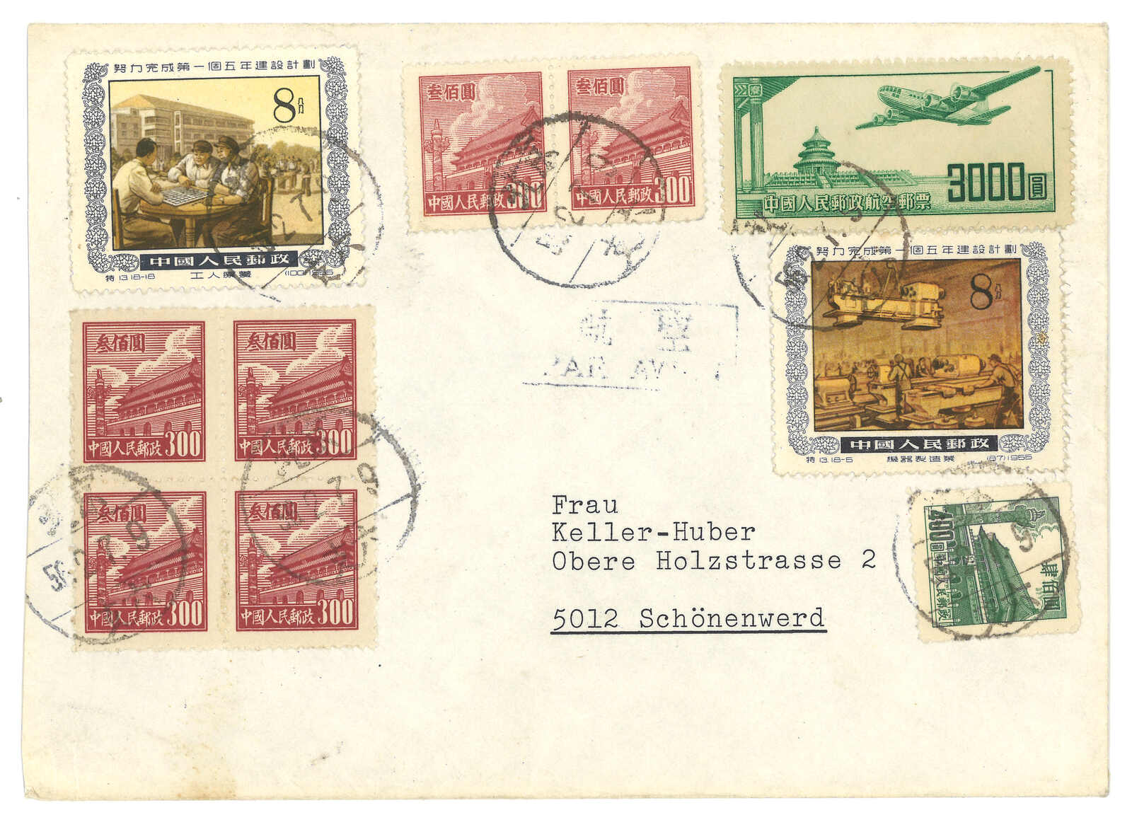 1956 Peking (7 Feb) to Germany, f.w. S13 Five Year Plan (18-5) and (18-18) and multipple R and airmail issues, tied by Peking Branch Six cds.